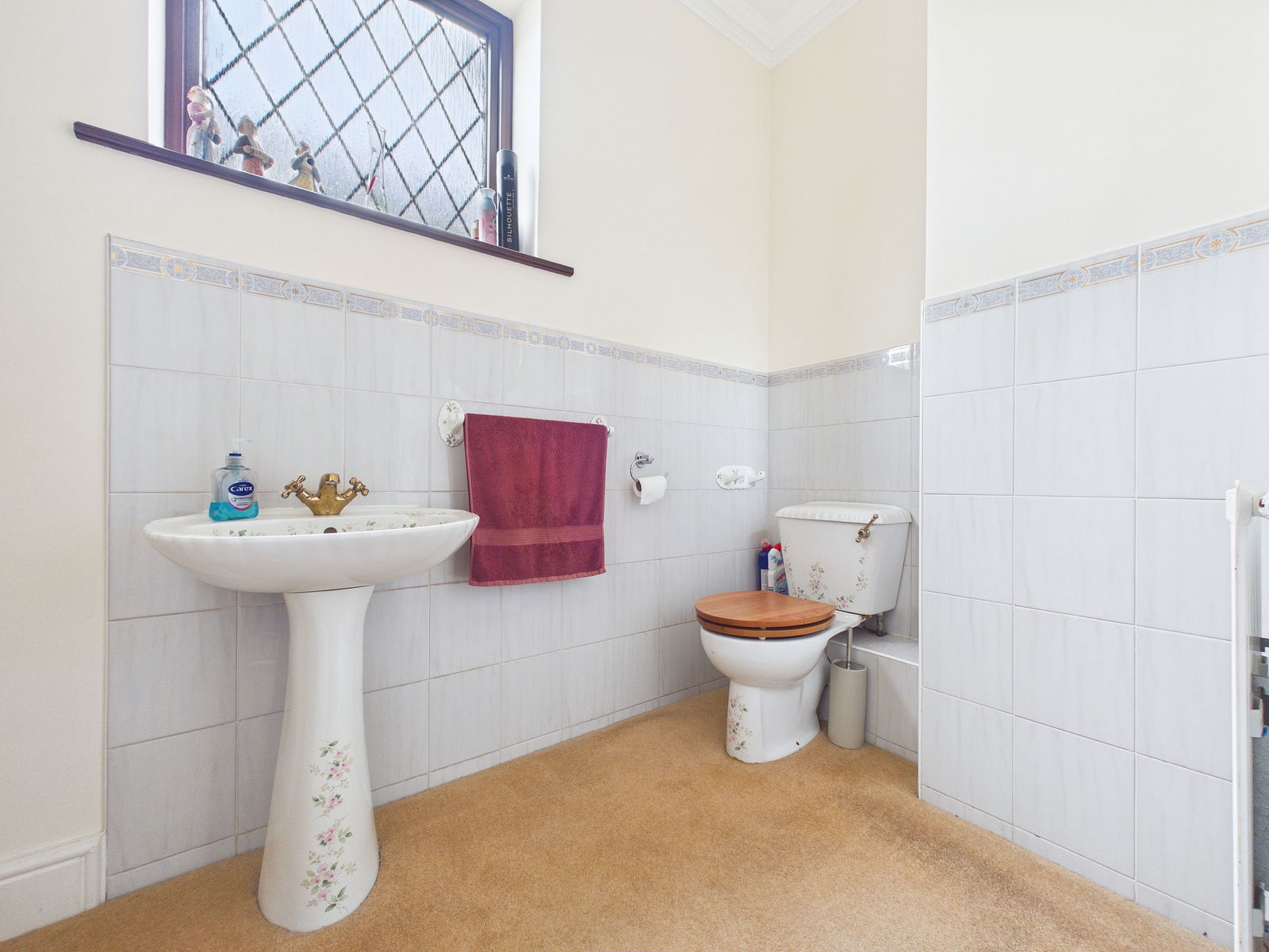 CLOAKROOM A useful ground floor cloakroom comprising low level WC and pedestal wash hand basin, with partially tiled walls, obscure uPVC double glazed window, and gas central heating radiator.