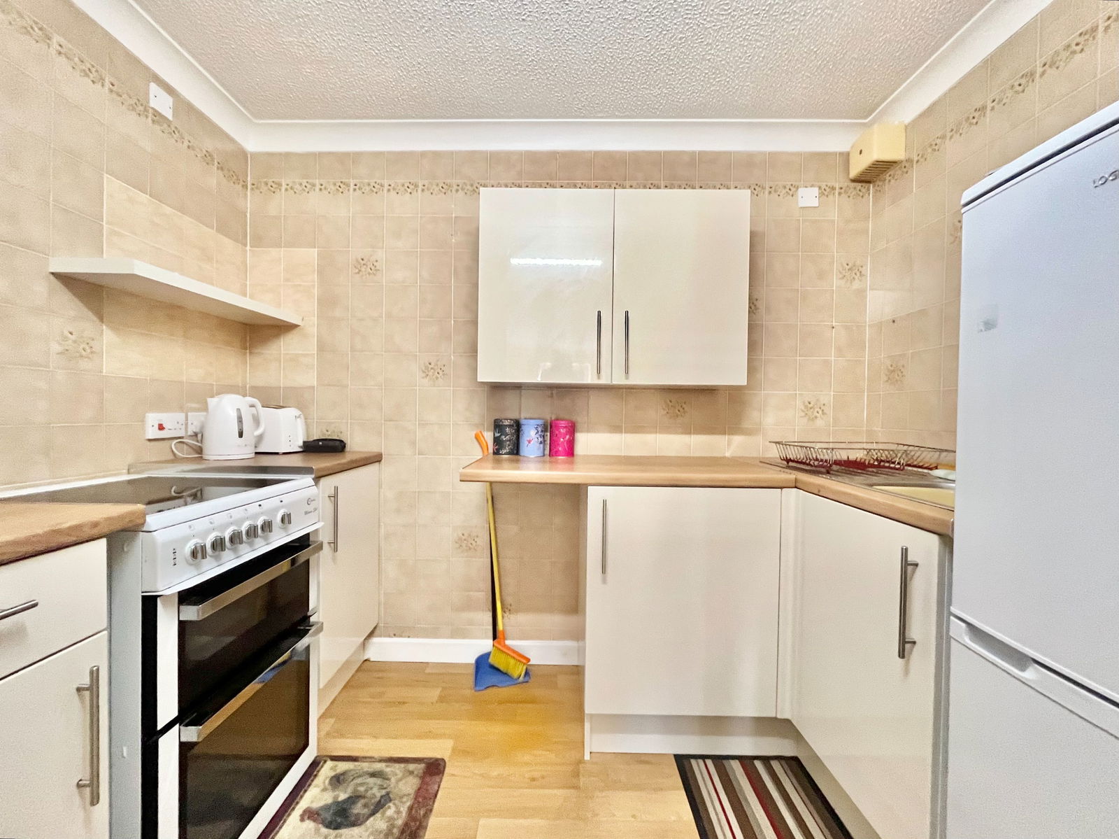 KITCHEN - 2.71m x 1.75m (8'10" x 5'8") A modern fitted kitchen boasting a range of overhead, base and drawer high gloss units with roll edged work surfaces above. A 1 bowl stainless steel sink and drainer unit, an electric cooker with a four ring induction hob, fridge/freezer and complimentary tile backsplash.