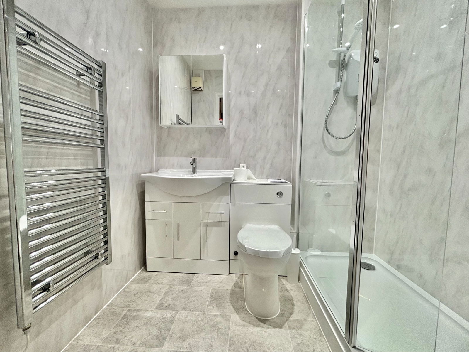 SHOWER ROOM A newly fitted, contemporary shower room featuring a walk in triple shower unit, low level WC, vanity wash basin with storage below, and complimentary wall panelling. Additional features include a chrome heated towel rail, extractor fan and mirrored medicine cabinet.