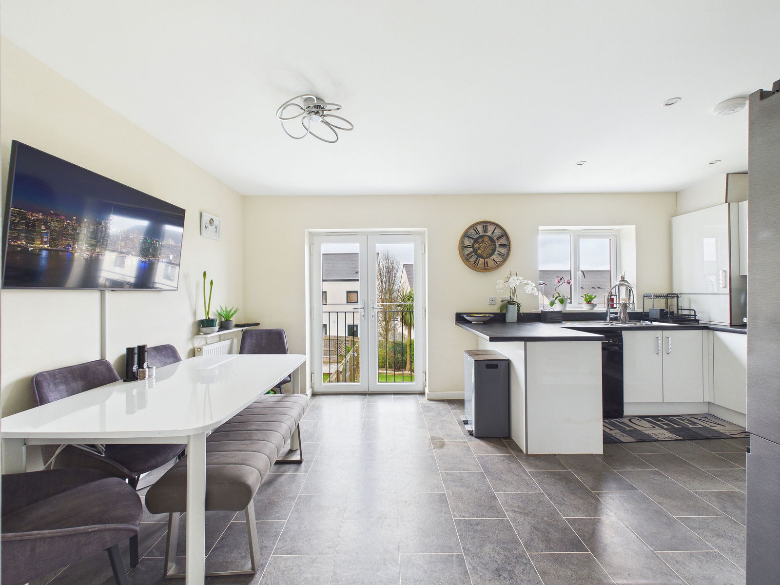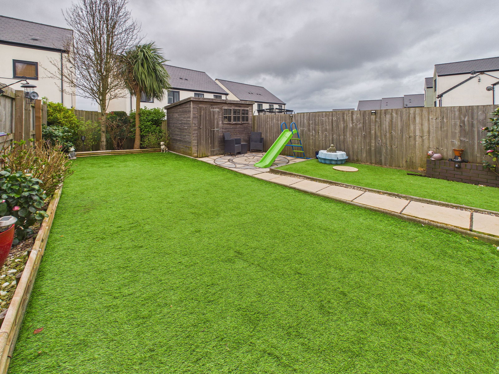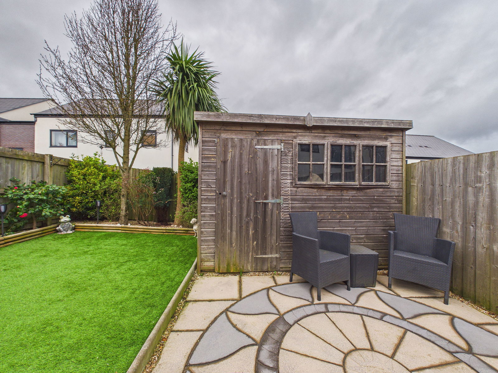 Externally, the property benefits from a beautifully landscaped rear garden designed with ease of maintenance in mind. It features a generous patio area ideal for alfresco dining, an artificial lawn, and a garden shed.