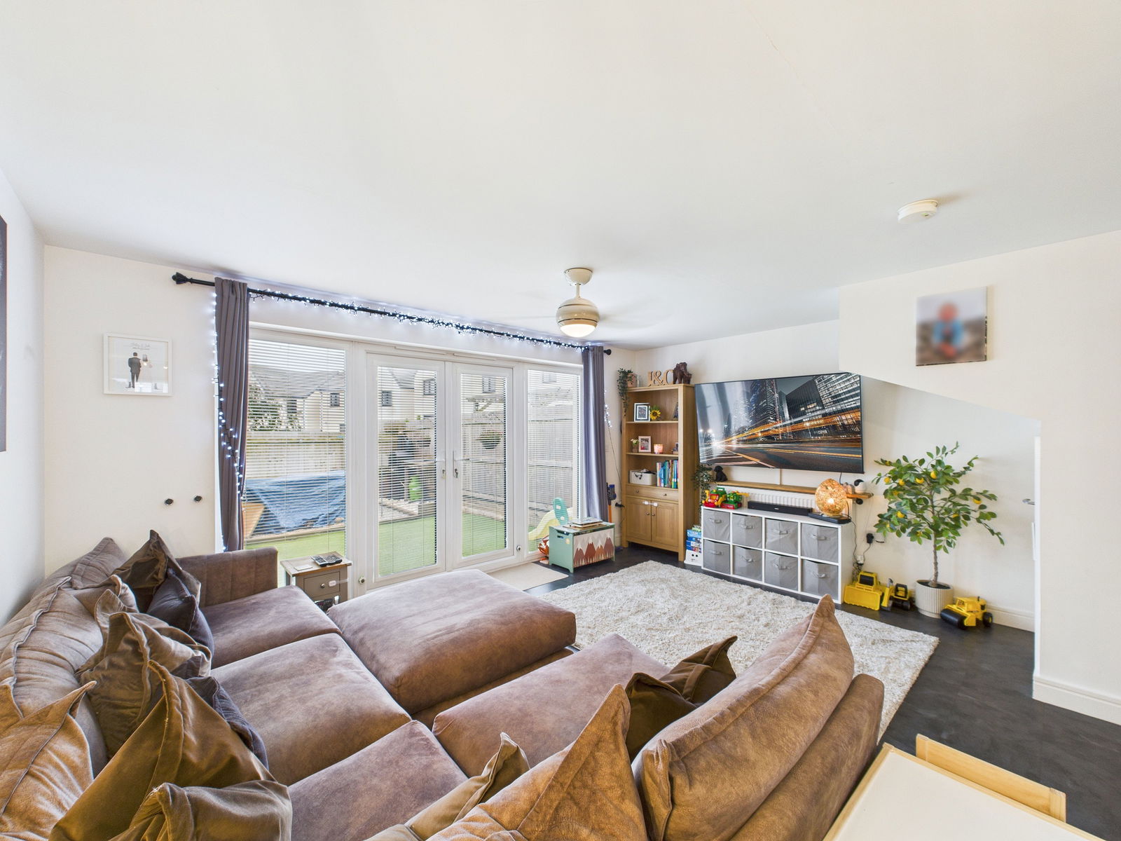 The living and dining areas offer plenty of room for furniture, featuring a TV point, two gas central heating radiators, a useful under stairs storage cupboard, and uPVC French doors that open directly onto the rear garden with full length side windows.