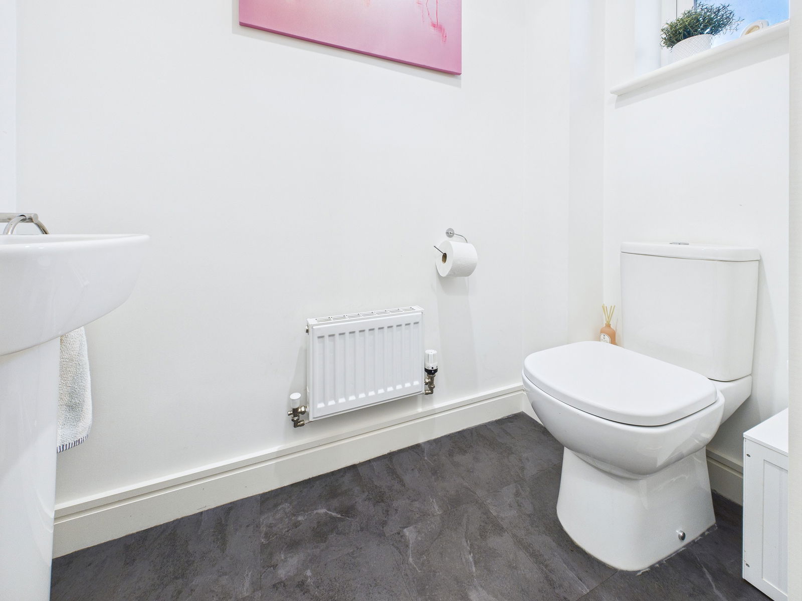 CLOAKROOM Conveniently located the cloakroom is fitted with a WC, pedestal wash basin, obscure uPVC double glazed window and a gas central heating radiator.