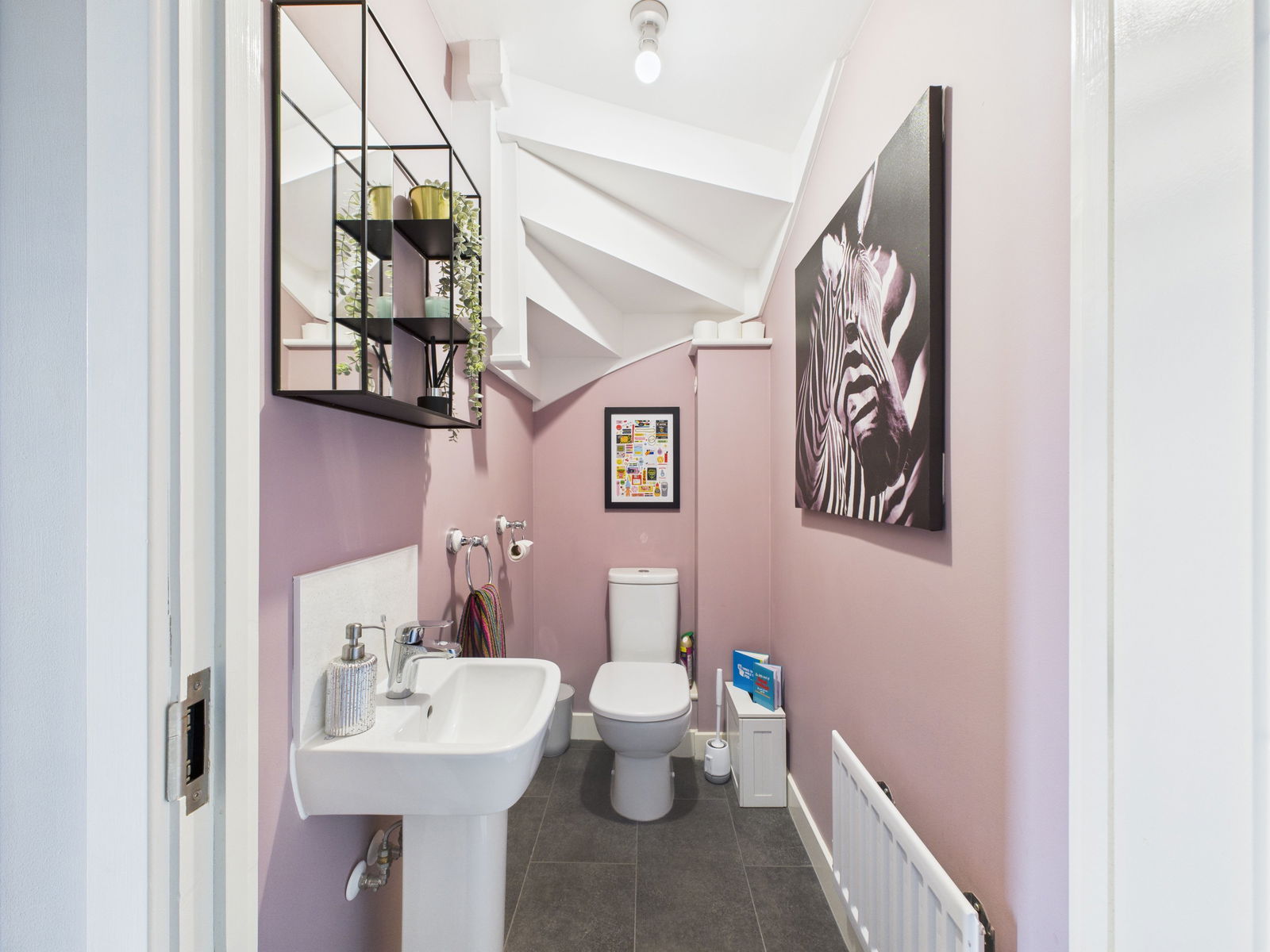 A wider than usual downstairs cloakroom with low level WC, pedestal wash hand basin, extractor fan and central heating radiator.