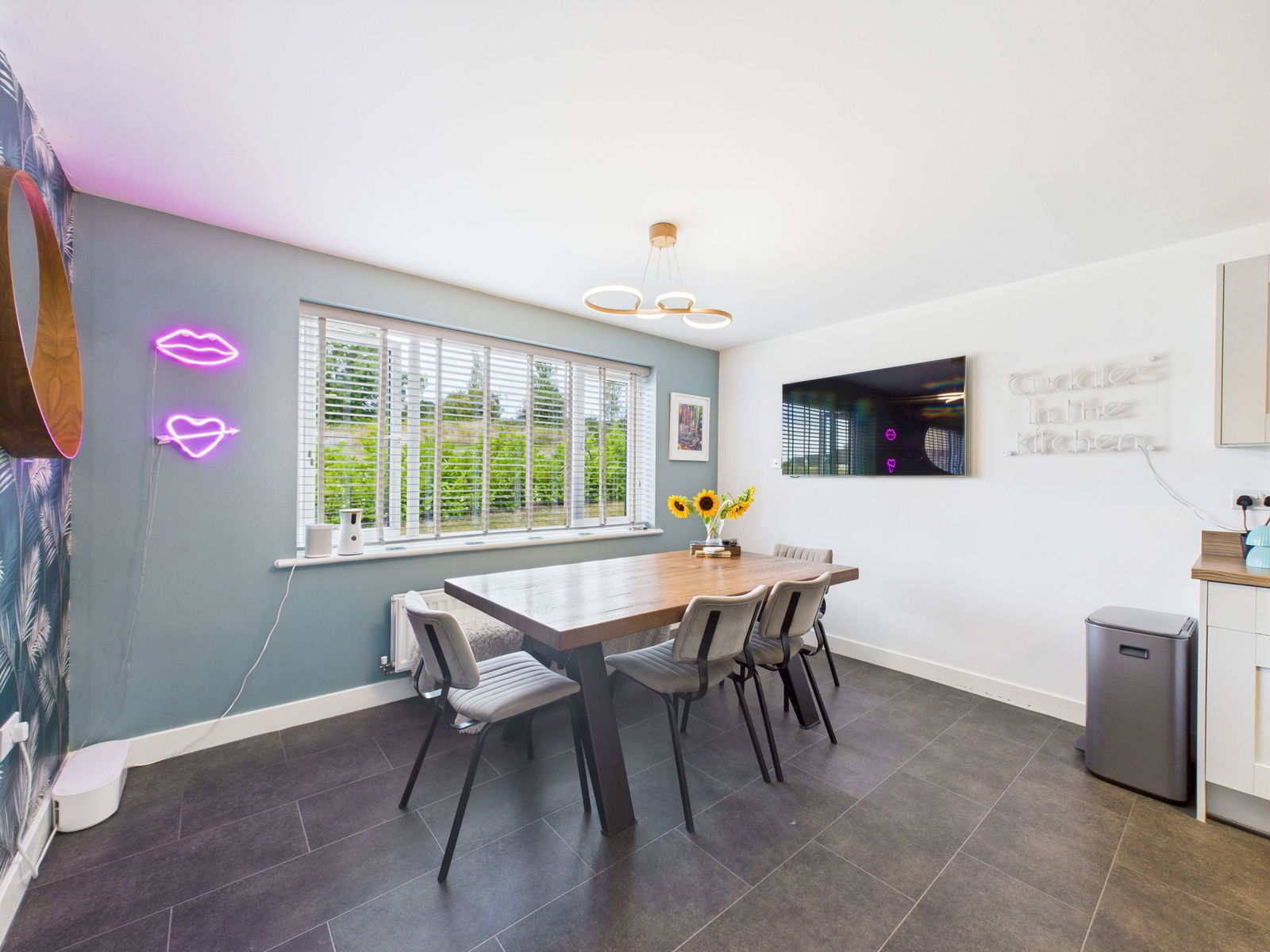 A modern spacious kitchen/diner ideal for modern day living, range of wall and base units with drawer units, range of integrated appliances including eye level electric double oven and grill, gas hob with extractor hood over as well as an integrated dishwasher and fridge/freezer. Space for a 6/8 seater dining table. u\PVC double glazed window, radiator.