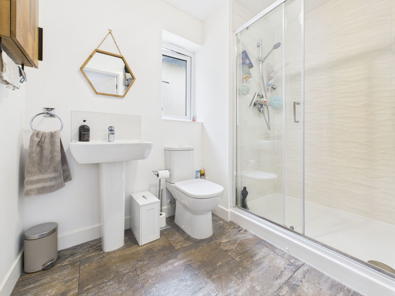 A contemporary master ensuite comprising low level WC, pedestal wash hand basin and a double walk in shower unit, tiling, uPVC double glazed window, extractor fan, central heating radiator.