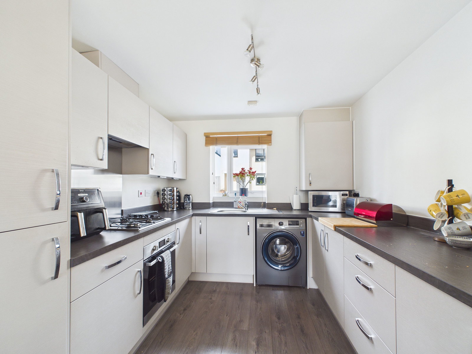 KITCHEN / LOUNGE / DINER A spacious and well-designed open-plan living area forming the central hub of the home. The kitchen is fitted with a modern range of units and work surfaces, incorporating an integrated fridge freezer, gas hob with extraction fan, electric oven, and space for a washing machine and dryer. The combination boiler is also housed within this space.