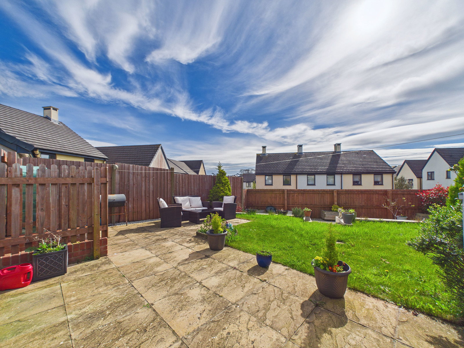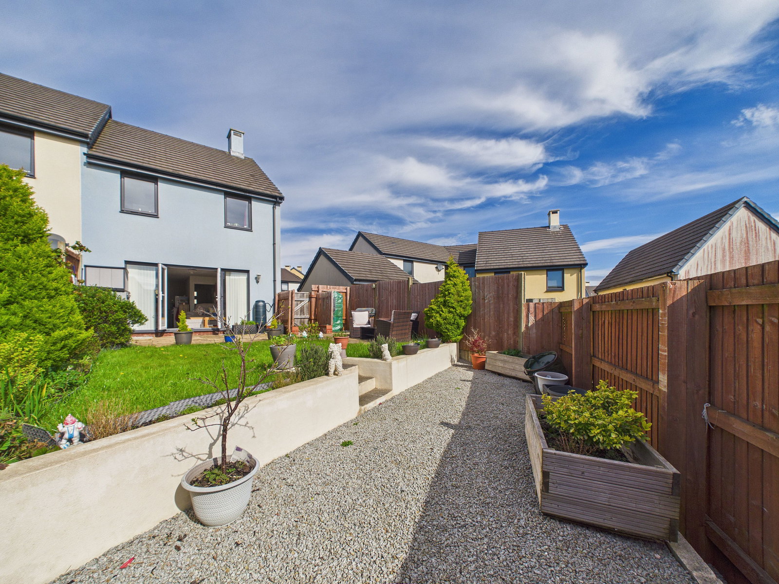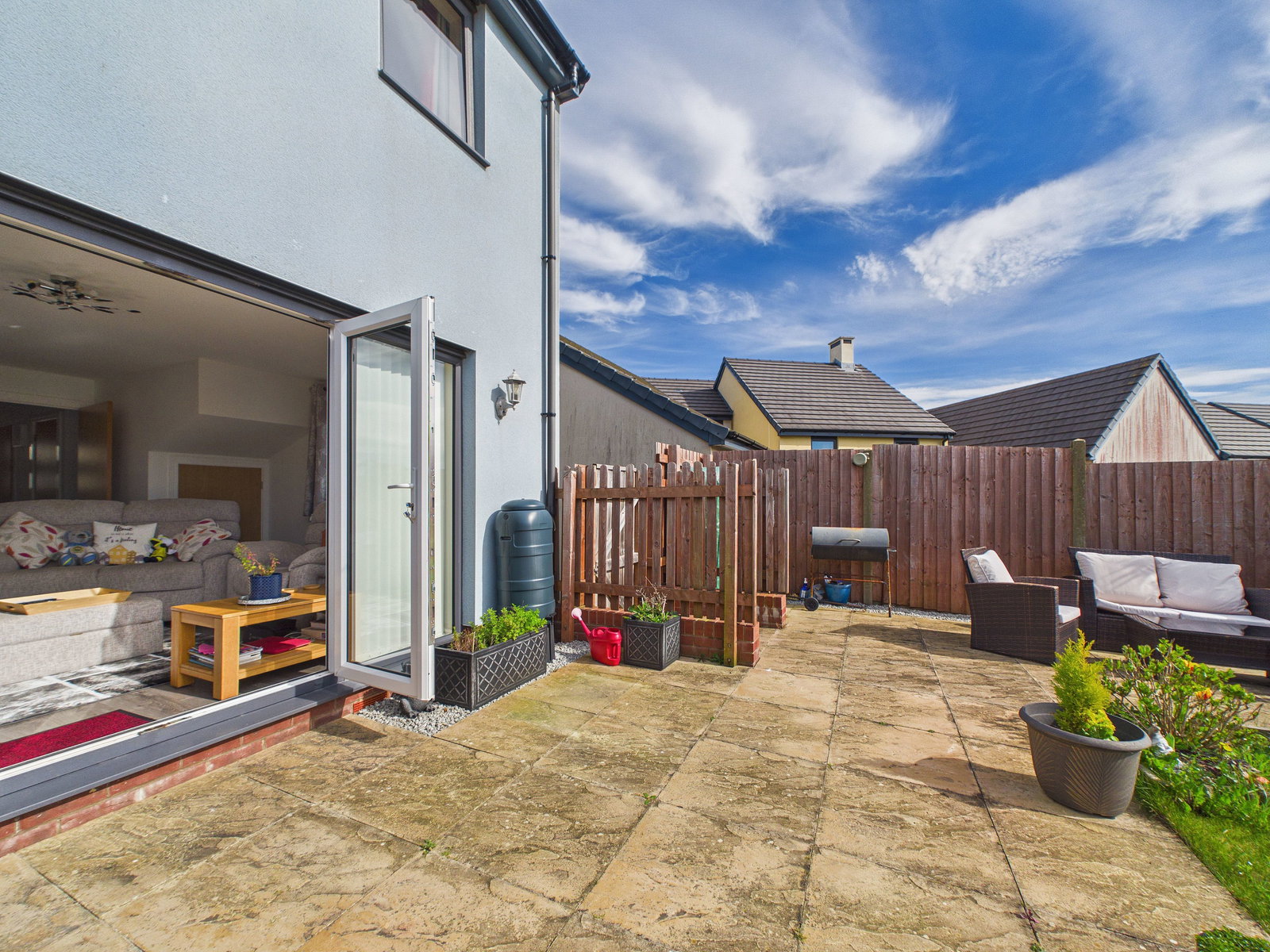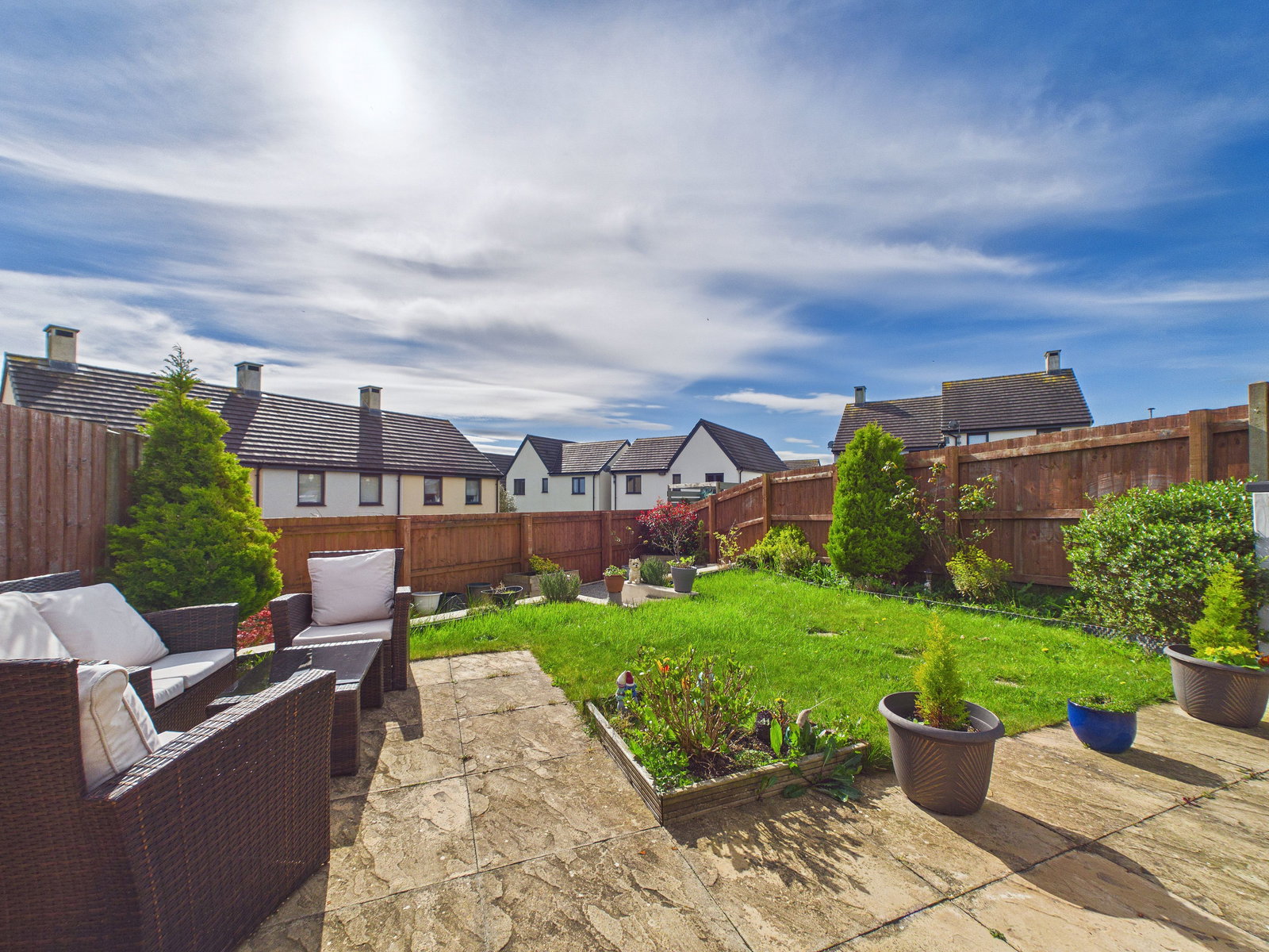 REAR GARDEN A generous south-west facing rear garden enjoying a particularly sunny aspect. Accessed via UPVC double glazed French doors onto a large patio space, leading onto a good sized turfed garden. The garden also benefits from a lower tier stone area, planting beds and space for outside sheds, creating a practical and well-balanced outdoor space.