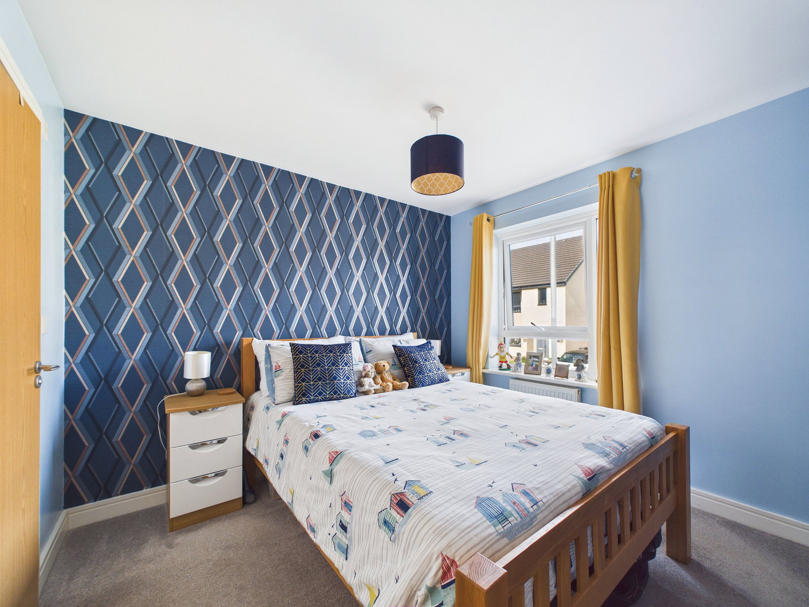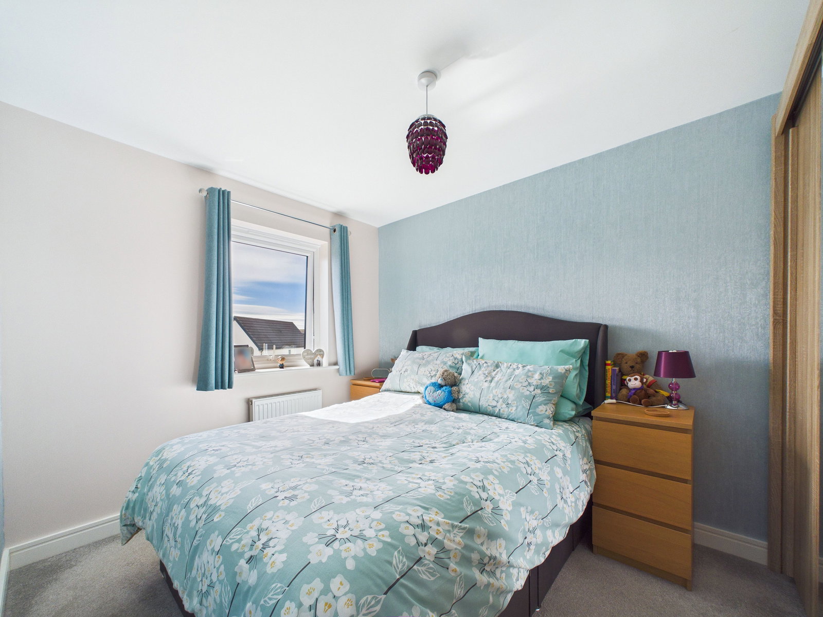 BEDROOM TWO A spacious double bedroom with carpet flooring, UPVC double glazed window unit and multiple socket points.