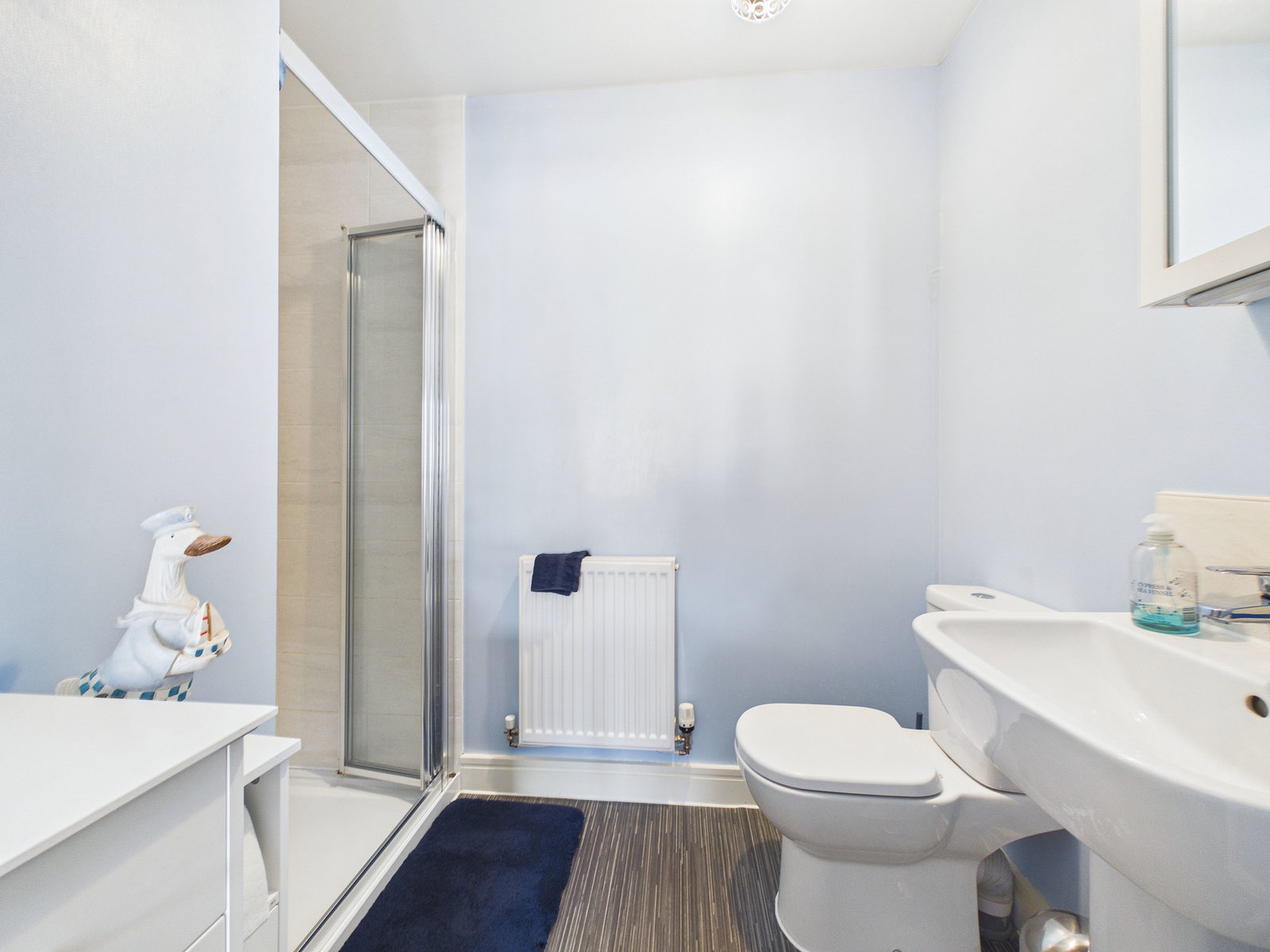 ENSUITE Comprising WC, vanity wash basin, radiator, extraction unit and a large walk-in shower with tiled walls within the shower area.