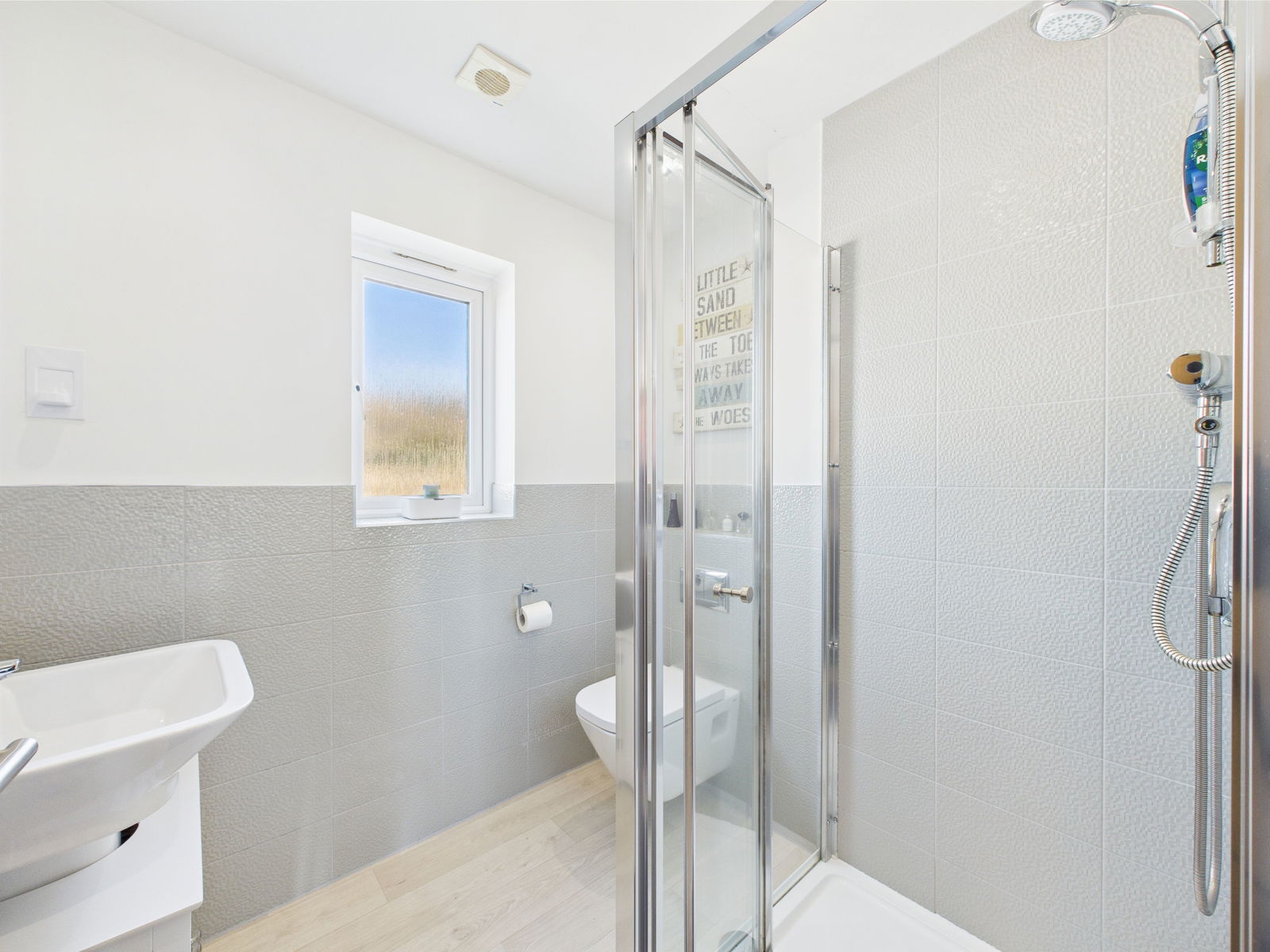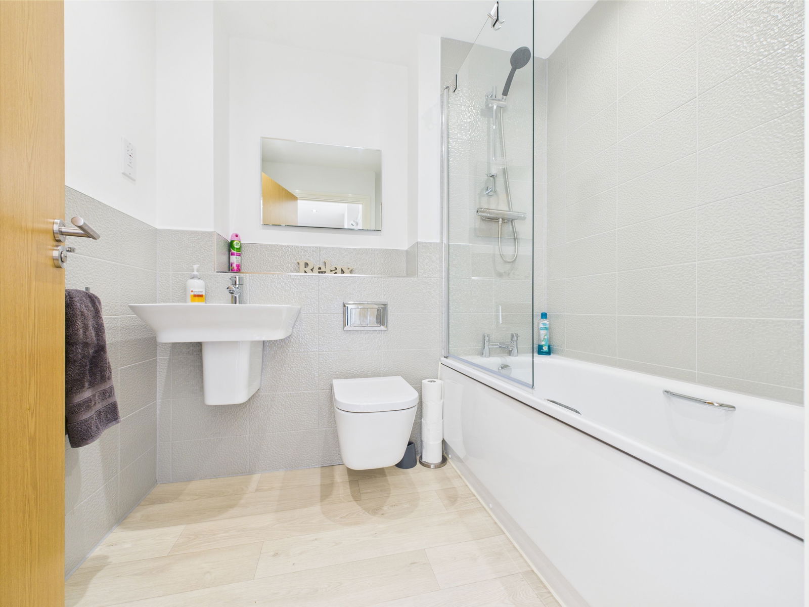 FAMILY BATHROOM A modern and well-appointed family bathroom featuring a panelled bath with shower over and glass screen, low level flush WC, and wall mounted wash basin. Enhanced with stylish tiling, extractor fan, shaver point and a chrome heated towel rail.