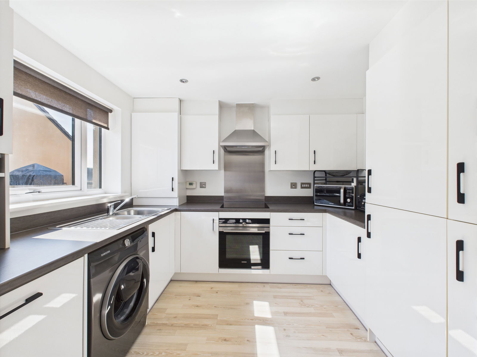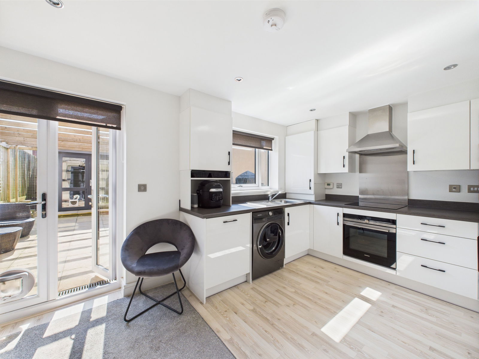 KITCHEN / DINER A beautifully bright and spacious kitchen/diner designed for modern living. It boasts an array of overhead, base, and drawer units with sleek roll-edged worktops above. Features include a 1.5 bowl stainless steel sink and drainer, an integrated electric smart self-cleaning oven and grill, four ring induction hob with extractor fan above, as well as an integrated fridge freezer, Samsung smart washing machine and dishwasher. A large fitted pantry and a cupboard housing the boiler offer excellent storage. Space for a six seater dining table, a wall mounted thermostat and uPVC double glazed French doors that open onto the sun drenched rear garden. Gas central heated radiator.