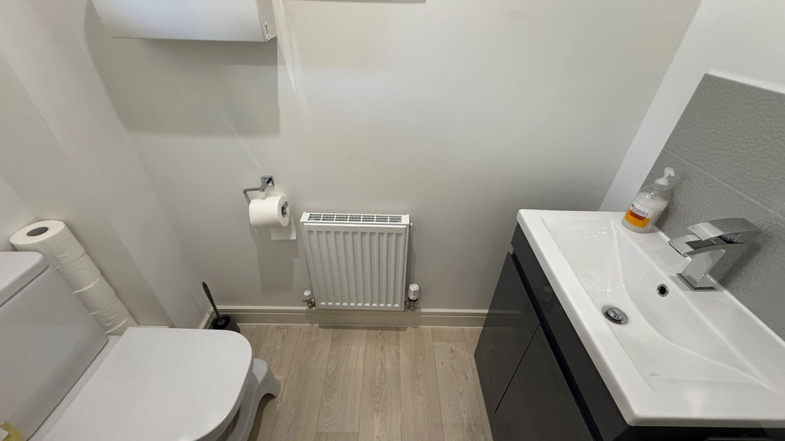 CLOAKROOM A sleek and modern cloakroom fitted with a low-level flush WC and a vanity wash basin complete with integrated storage below. Additional features include a gas central heating radiator, fuse box and a uPVC obscure double glazed window.
