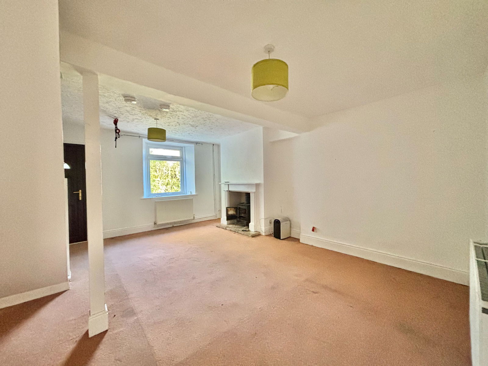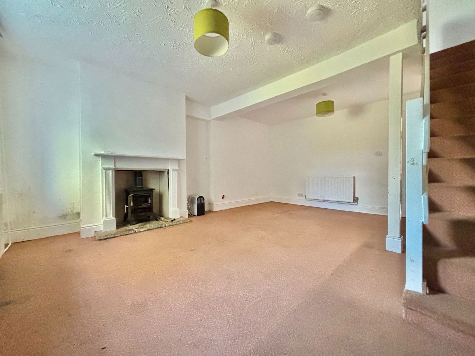 LIVING ROOM – 5.83m x 4.51m (19'1" x 14'9") A UPVC front door opens into an impressively spacious lounge/diner, offering ample room for both relaxation and entertaining. The space features a charming log burning stove, staircase rising to the first floor, UPVC double glazed window, TV and internet points and a gas central heated radiator.