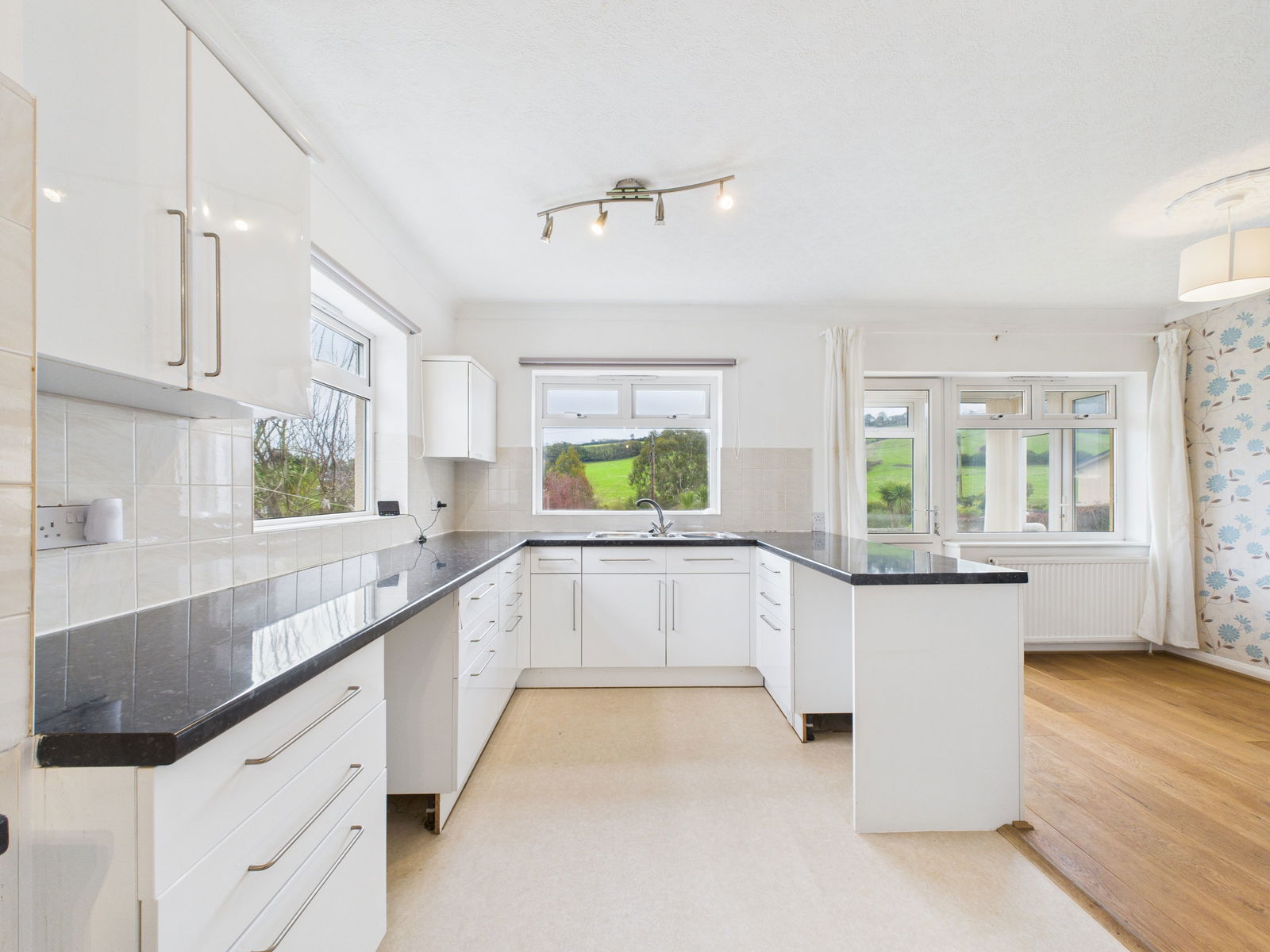KITCHEN A spacious and well appointed kitchen with an extensive range of wall, base and drawer units complemented by roll edged worktops. Features include a two bowl stainless steel sink with drainer, an integrated eye level electric double oven and grill, a four ring gas hob, and plumbing for both a washing machine and fridge freezer. With ample space for a 6 seater dining table, this dual aspect room enjoys stunning countryside views and access to the rear porch.