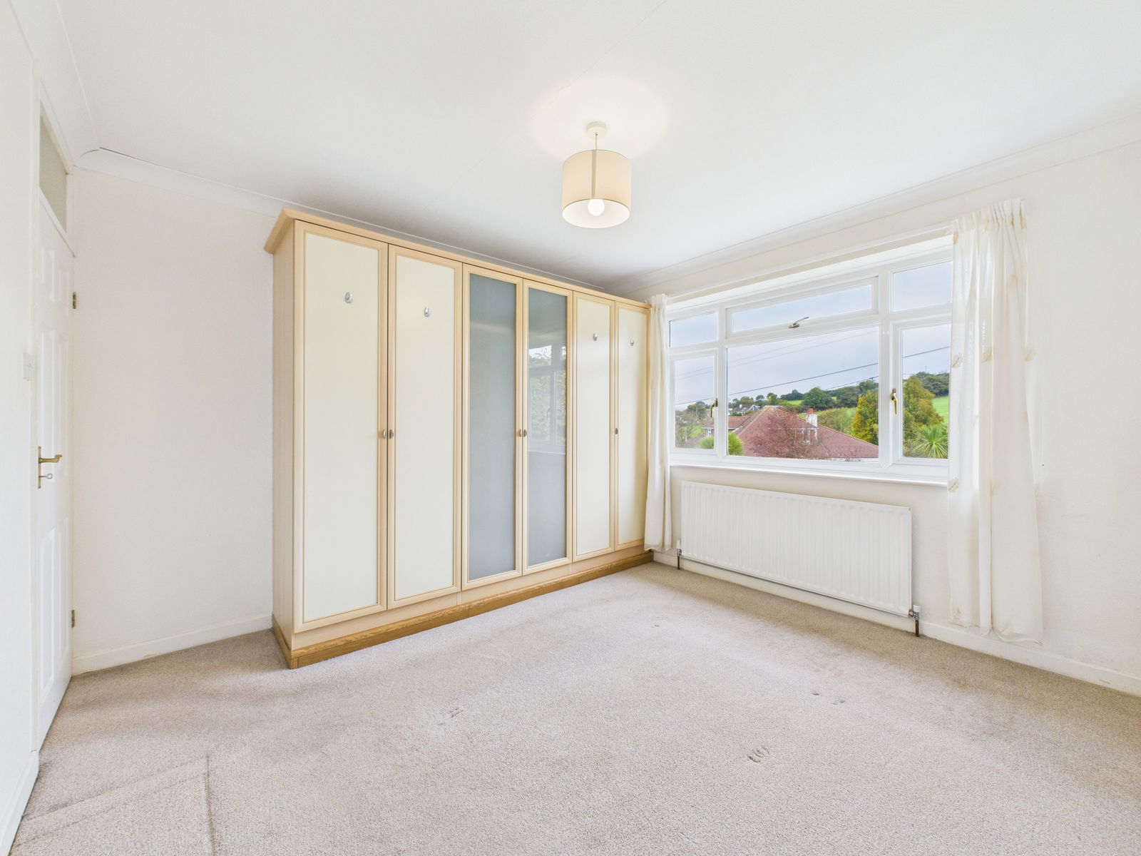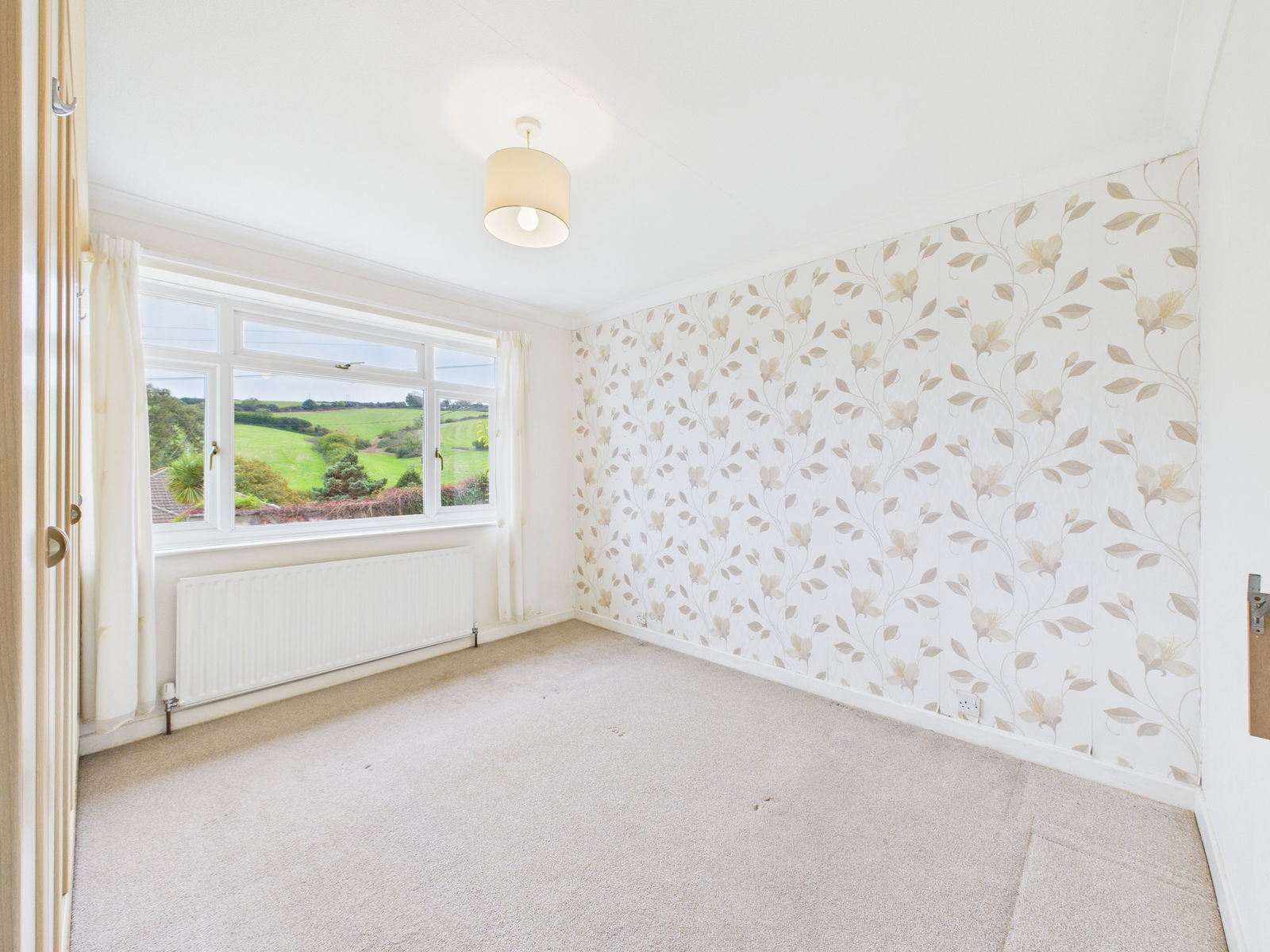 BEDROOM TWO A spacious second double bedroom offering delightful countryside views, built in wardrobes, a uPVC double glazed window, and a gas central heating radiator.