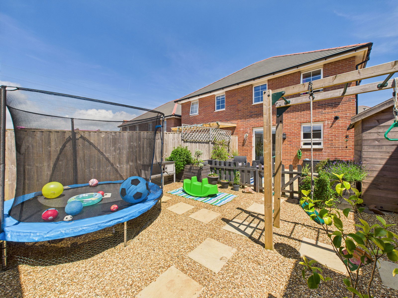 OUTSIDE A sun soaked south west facing enclosed rear garden that has been thoughtfully designed for ease of maintenance with a large patio area with a raised flower bed border perfect for alfresco dining and entertaining, with a further section laid to pebble stones.