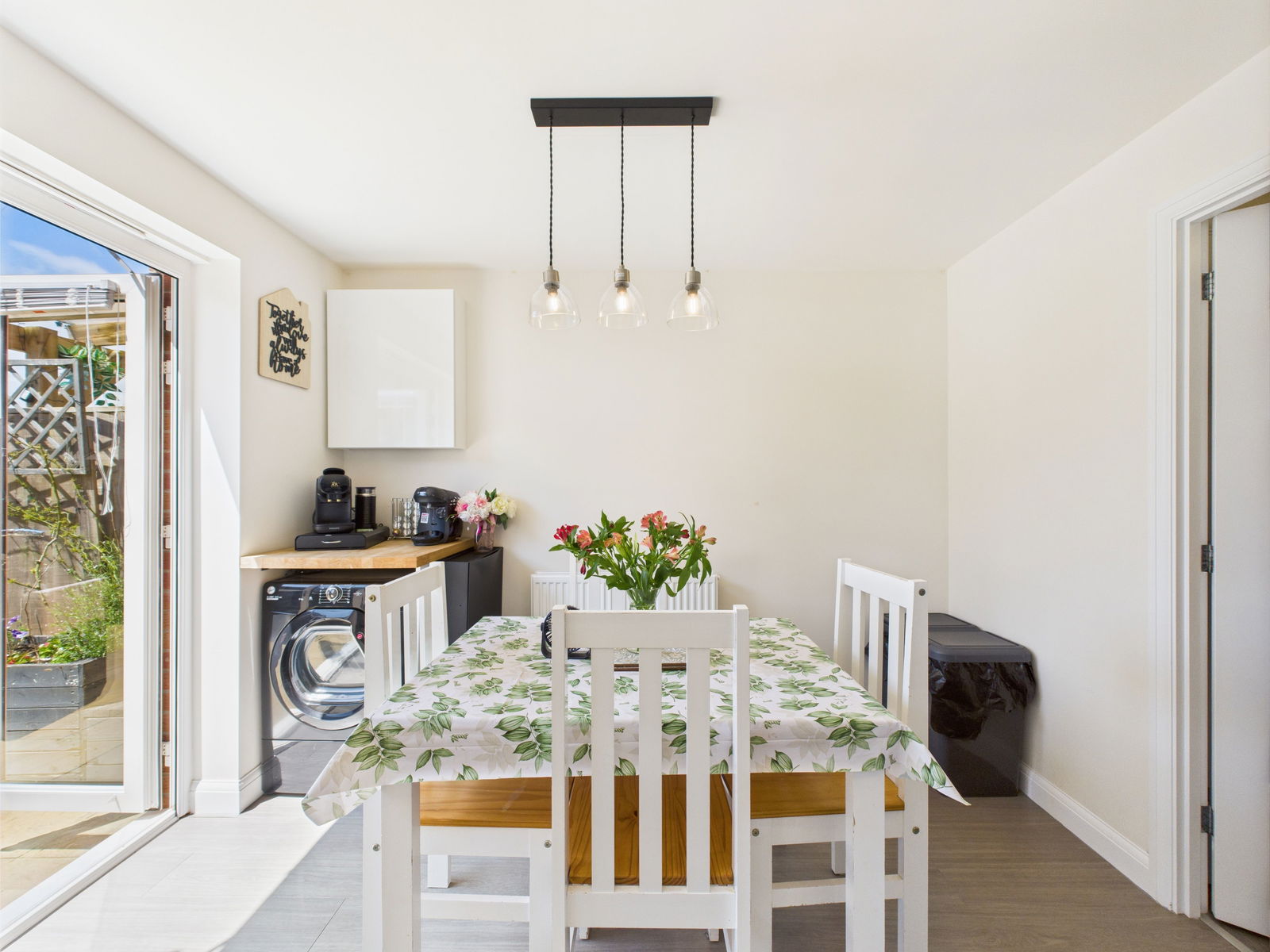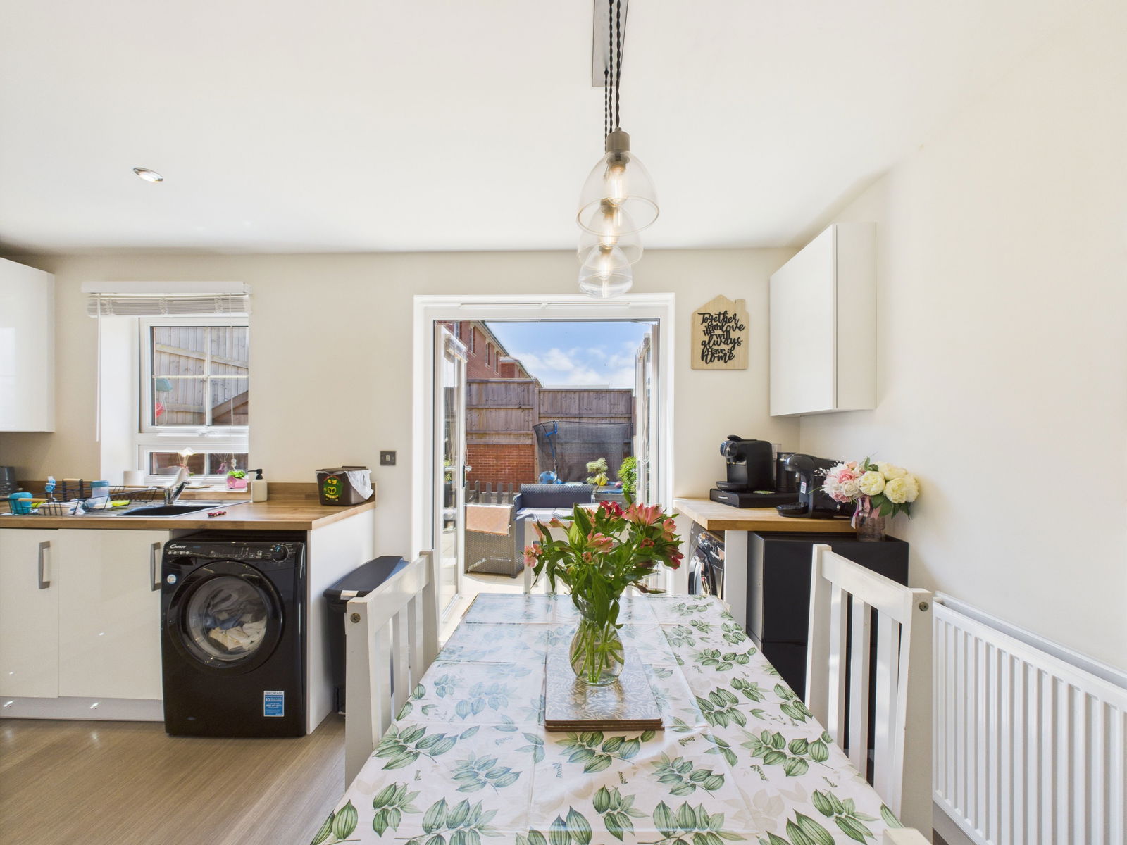 KITCHEN/DINER A beautifully bright and modern kitchen/diner offering a range of overhead, base and drawer units with roll edged work surfaces above. A 1 bowl stainless steel sink and drainer unit, an electric single oven with grill integrated and a four ring gas hob with extractor hood above. An integral dishwasher, space and plumbing for a washing machine and fridge freezer, uPVC double glazed windows and uPVC French doors leading out to the sun soaked rear gardens.