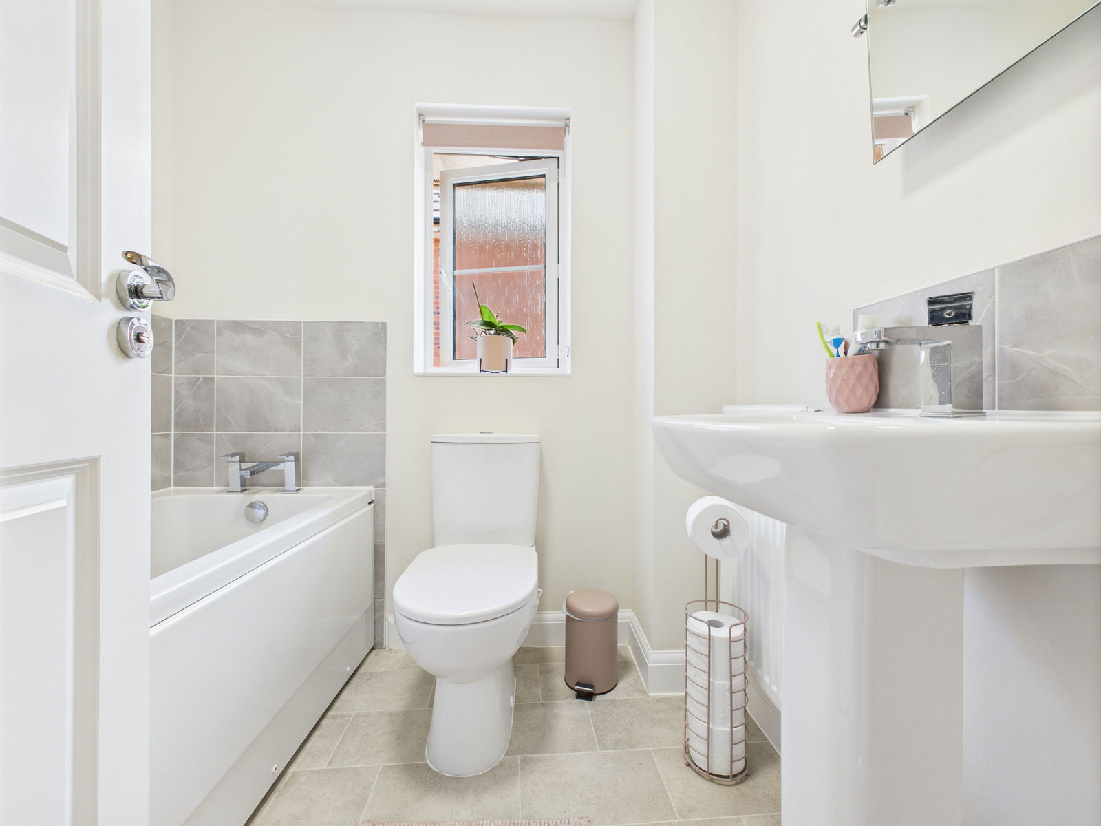BATHROOM A contemporary family bathroom boasting a low level flush WC, a pedestal wash hand basin and a panelled bath unit. Part tiled walls, UPVC obscure double glazed window and a gas central heated radiator.