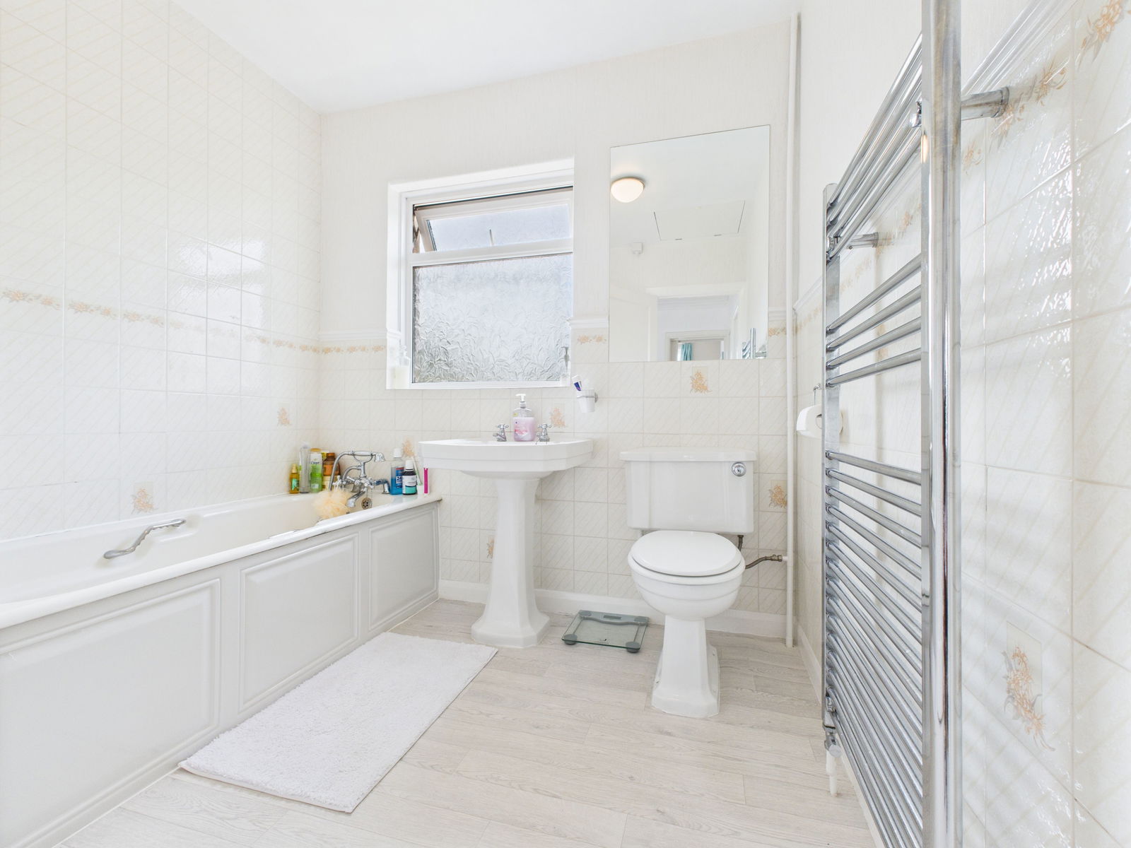 A generously sized family bathroom featuring a panelled bath with shower attachments above, pedestal wash hand basin, and low level WC. Finished with tiled walls, a deep airing cupboard, chrome heated towel rail and a uPVC obscure double glazed window.