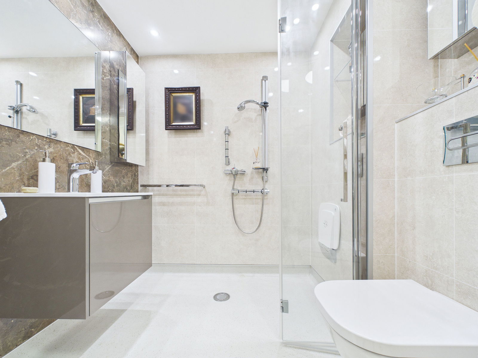 SHOWER ROOM A stand out shower/wet room, three mirrored cabinets, wall hung radiator, low level WC, wash basin, shower with adjustable glass shower screen.