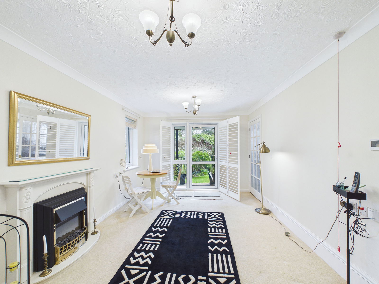 LOUNGE A lovely lounge with wooden hearth surround, inset electric fire, two windows to side, thermaskirt heating, French doors out to patio with wooden white Hilary blinds.