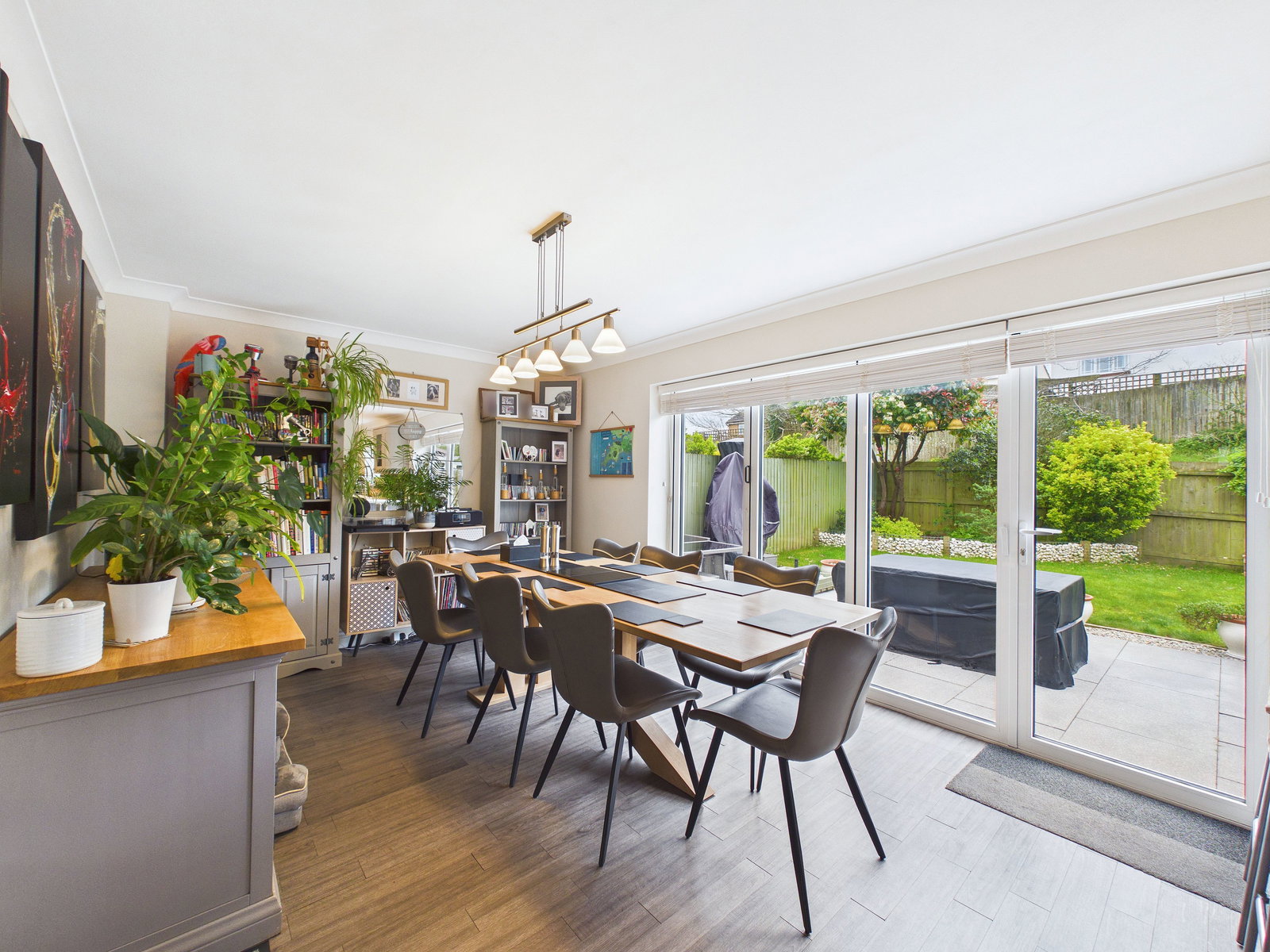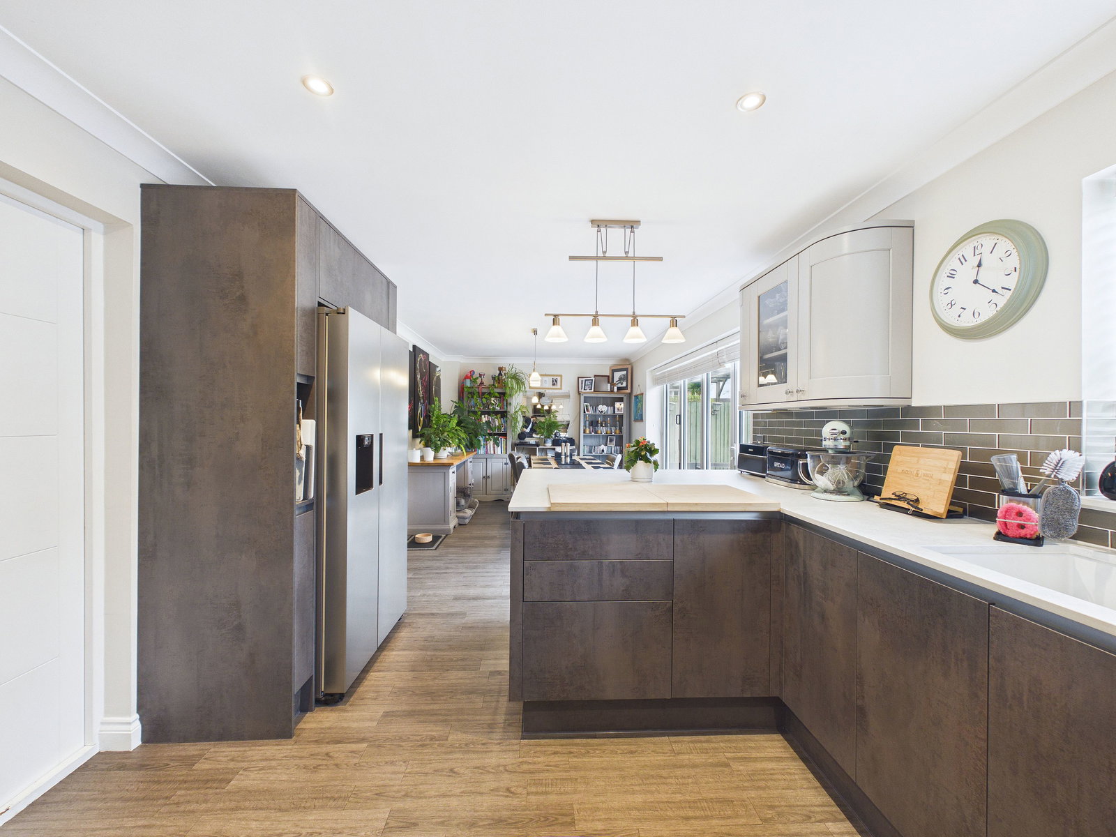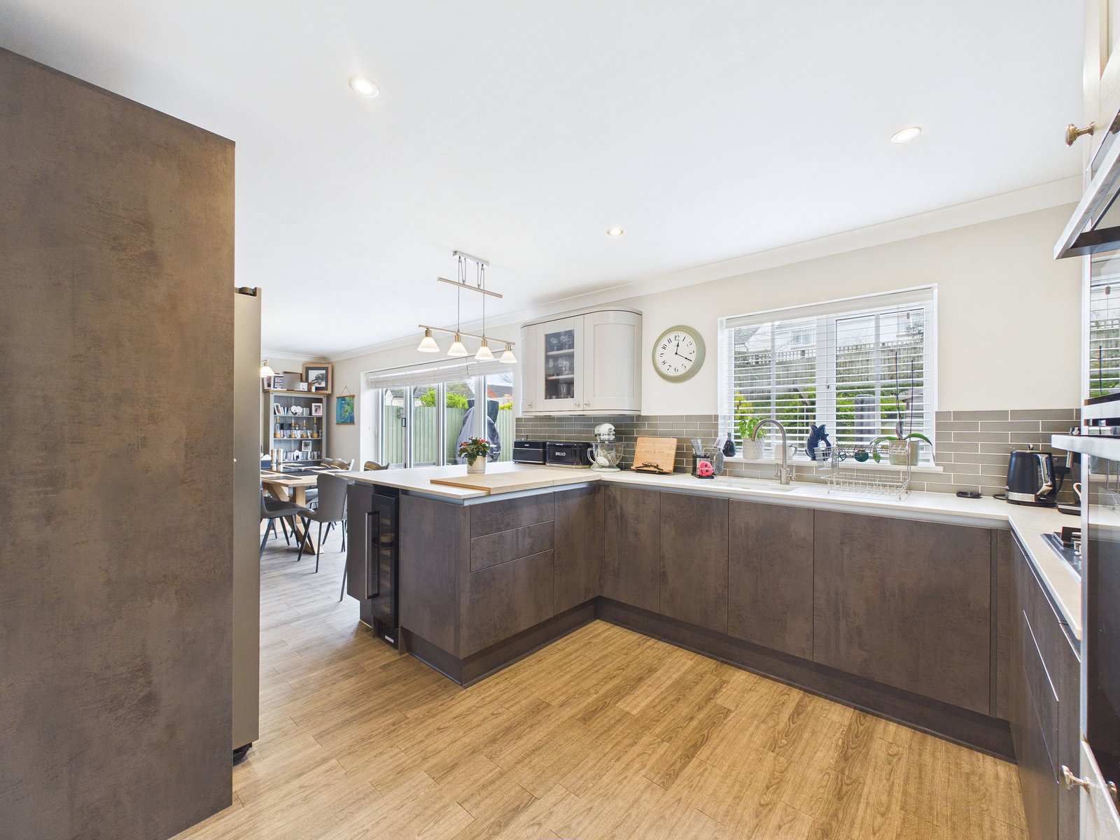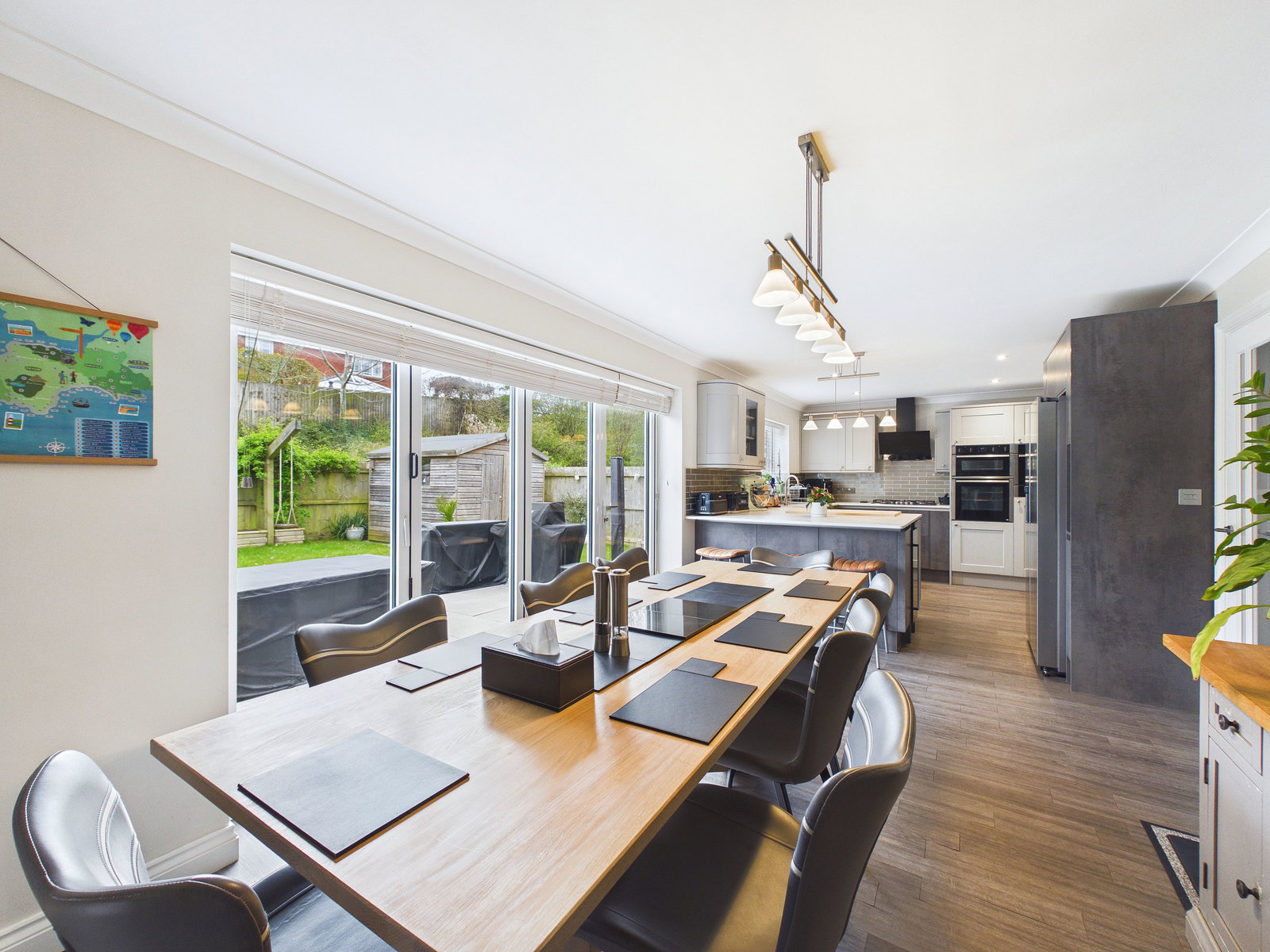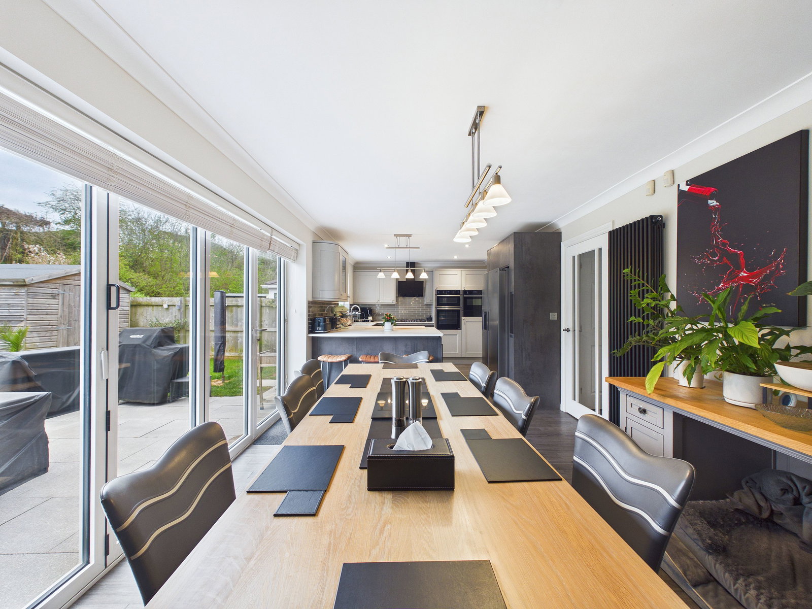 KITCHEN/DINER - 8.3m x 3.1m (27'2" x 10'2") This stunning kitchen diner has been carefully and stylishly finished by the current owners and offers a superb range of grey slate effect contemporary kitchen units with porcelain work surfaces over including an inset draining board with ceramic sink and mixer tap over. There are range of integrated appliances which include an AEG five burner stainless steel gas hob with contemporary cooker hood over, Neff double oven and grill plus combination microwave with warming drawer below. There is a large worksurface with breakfast bar to one side separating the kitchen and dining area. A matching cabinet will house an American style fridge/freezer whilst there is also an integrated dishwasher. Glass Metro tiling to the walls. Double glazed window overlooking the rear garden. Spotlights to ceiling. Courtesy door to garage/utility room. The dining area has been carefully planned to accommodate an 8 to 10 seater dining table plus there are full width fold back double glazed doors which will bring the rear garden into the dining area which is perfect for entertaining, summer barbecues and such like.