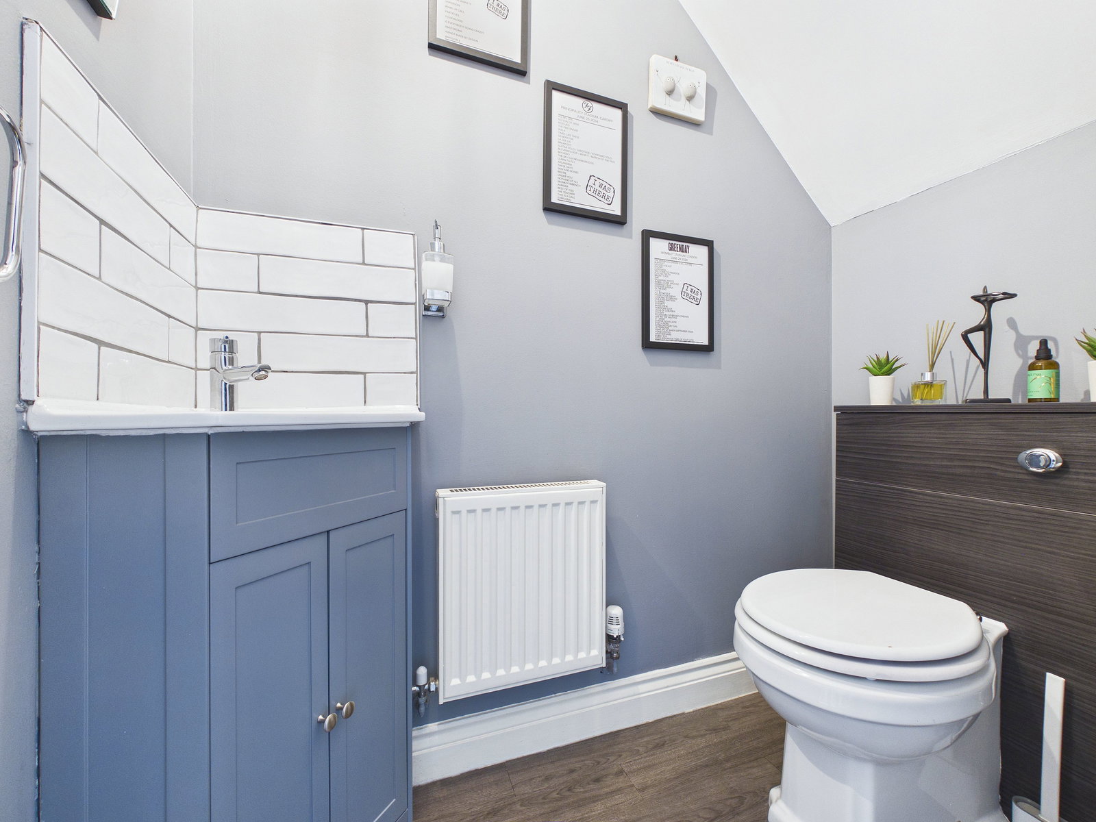 CLOAK ROOM Fitted with a white suite comprising corner vanity unit with inset washed hand basin and low-level WC with concealed cistern. Radiator.