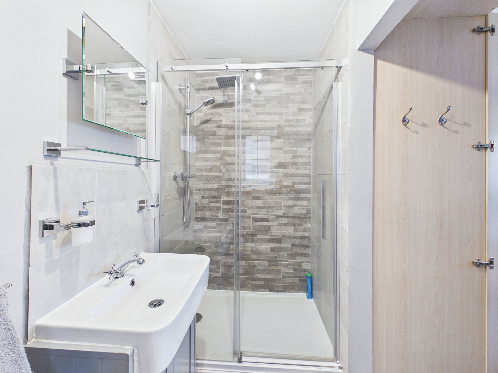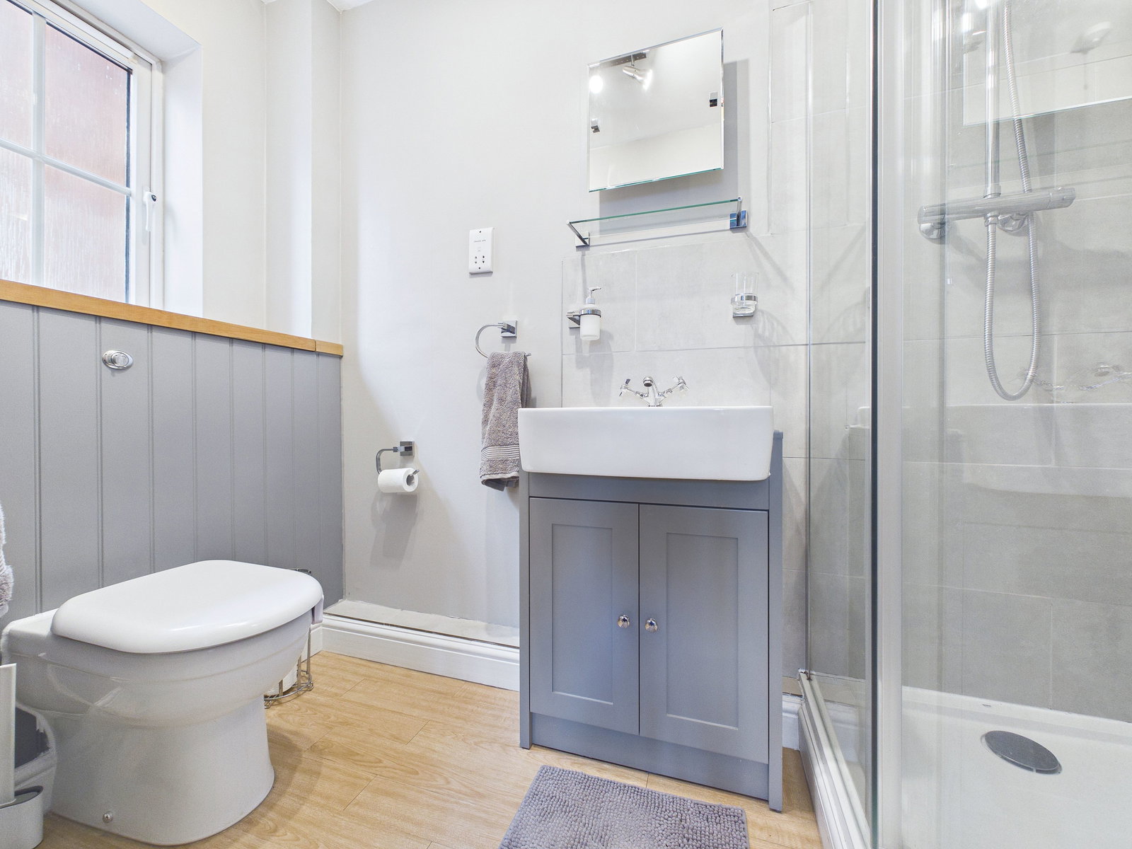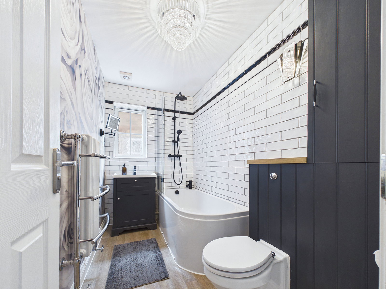 FAMILY BATHROOM Finished in a Victorian/art deco style this bathroom has a white suite complimented with grey painted tongue and groove panelling and comprises of a bath with contemporary black mains fed shower unit over and glass splash screen. Vanity unit with inset Victorian style wash basin with mixer tap over. Close couple of WC with concealed system and dual flush. Built in toiletries cupboard. Art deco style wall light. Metro tiling to the walls with ‘ picture rail ’ border tiling. Double glazed window. Victorian style a radiator with chrome towel rail over. Shaver point. Illuminated vanity wall mirror.