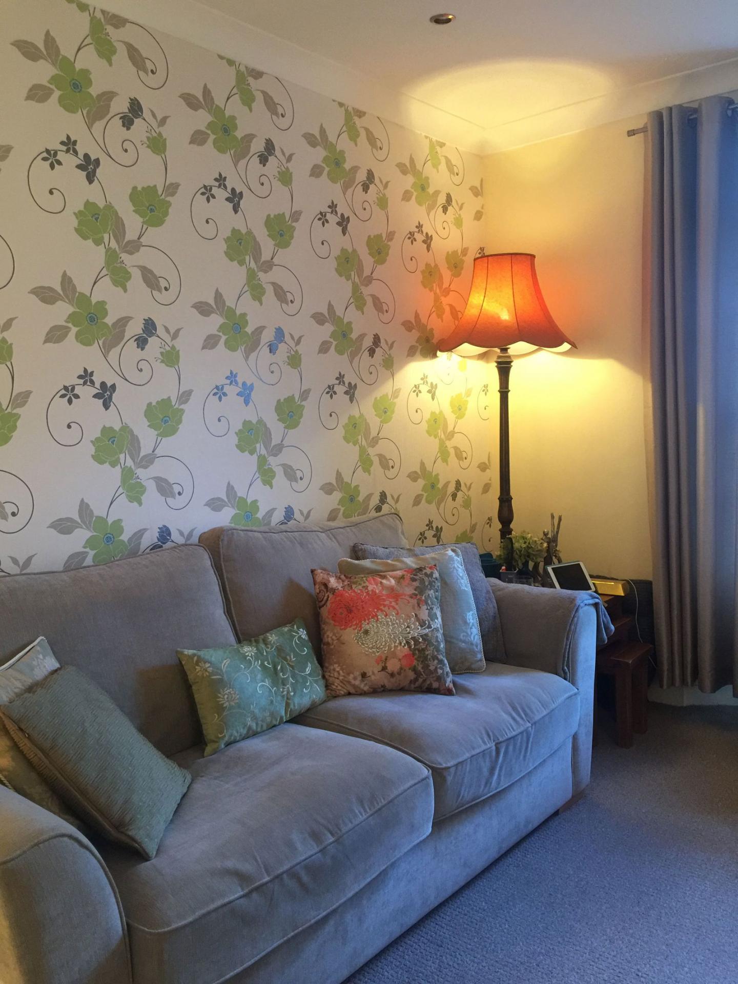 LOUNGE - 3.91m x 3.52m (12'9" x 11'6") Featuring attractive arched sash window with pleasant outlook over communal driveway and flower beds, with mature magnolia tree as a focus point. Coved ceiling with downlighters. Folding door through to galley kitchen.