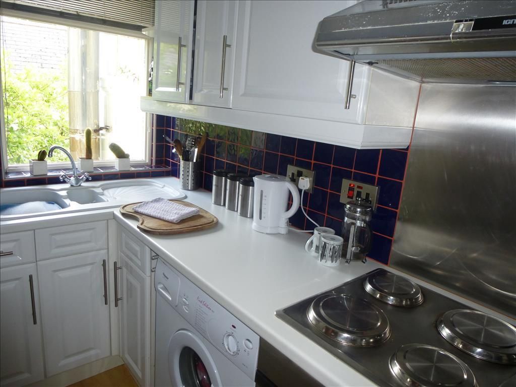 KITCHEN - 3.23m x 1.41m (10'7" x 4'7") White finished units with melamine work surfaces with inset four ring electric hob with oven beneath, stainless steel splashback and matching stainless steel cooker hood. Range of wall cabinets and base cupboards for storage with drawers, bottle rack. Inset sink unit with chrome mixer tap, with navy blue wall tiles to complement the white. Recess for fridge/freezer and automatic washing machine. Coved ceiling, ceiling downlighters and window with side aspect. From the reception hallway three steps lead down to lower hallway