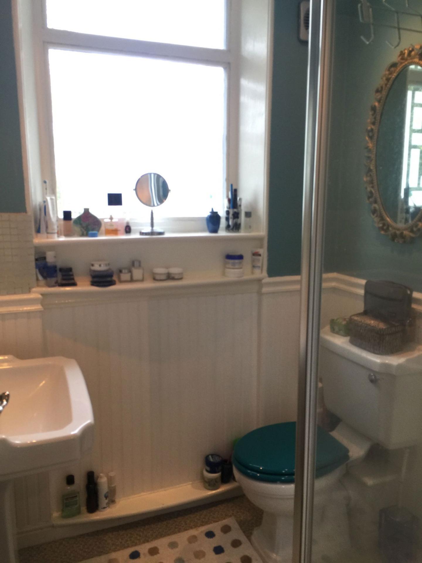 SHOWER ROOM White suite with pedestal hand wash basin, close couple WC, shower cubicle, extractor fan, coved ceiling, window with side aspect towards Higher Warberry Road, ceiling downlighters, half dado height painted panelling.