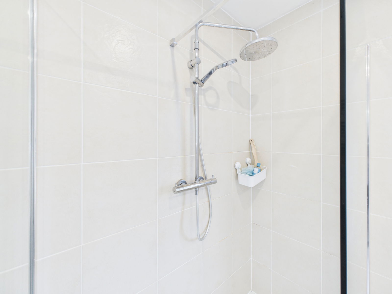 A large modern refurbished bathroom, double sized glass shower unit, modern bath, low level WC, wall hung radiator, wash basin vanity unit, combi boiler.