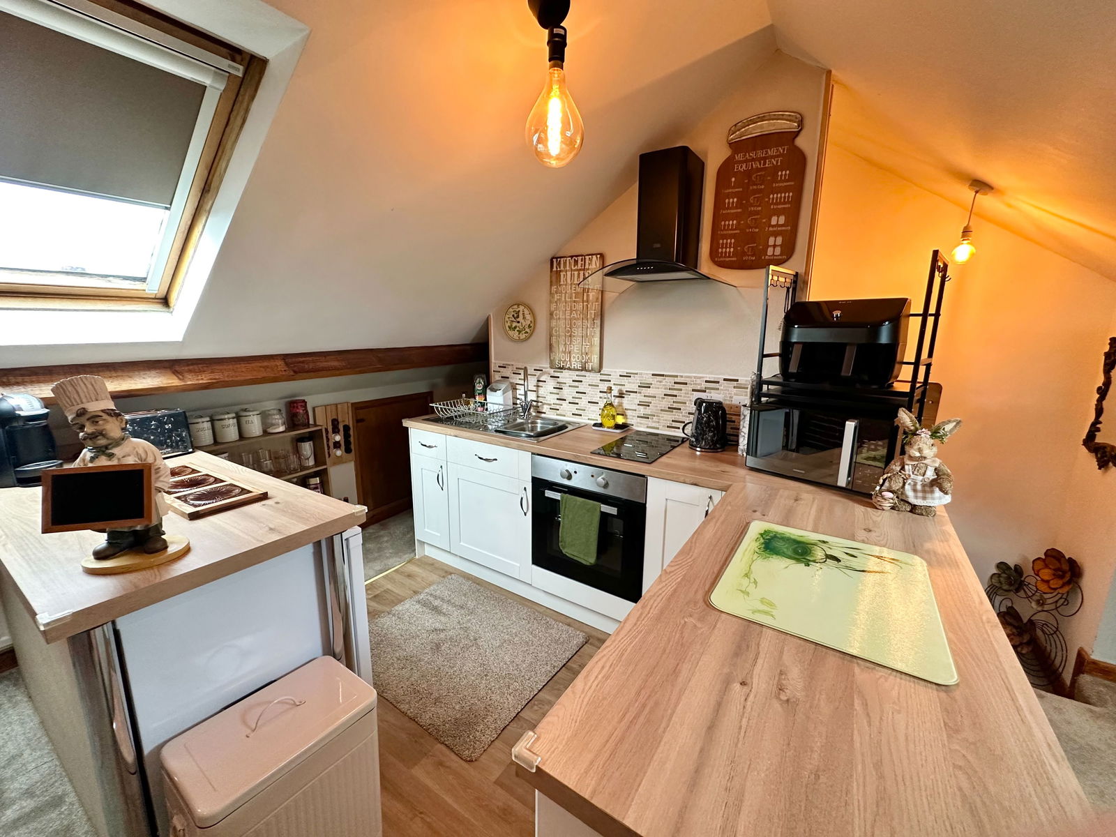 Accessed via a carpeted staircase from the first floor. A bright and versatile area that is ideal as a secondary kitchen and living space for perhaps an older teen looking for their own space or a mature family member. There is a kitchen area fitted with modern units comprising cupboards and drawers. Modern square edge work surfaces with inset one bowl stainless steel sink unit with mixer tap. Fitted electric oven and fitted electric hob with cooker hood above. A fridge and a freezer included. There is wood effect flooring in this section that opens into a cosy carpeted snug area. Two radiators and two roof windows with fitted blinds. Feature brick chimney breast creating the perfect focal point to the room. Two doors opening into handy eave storage space.