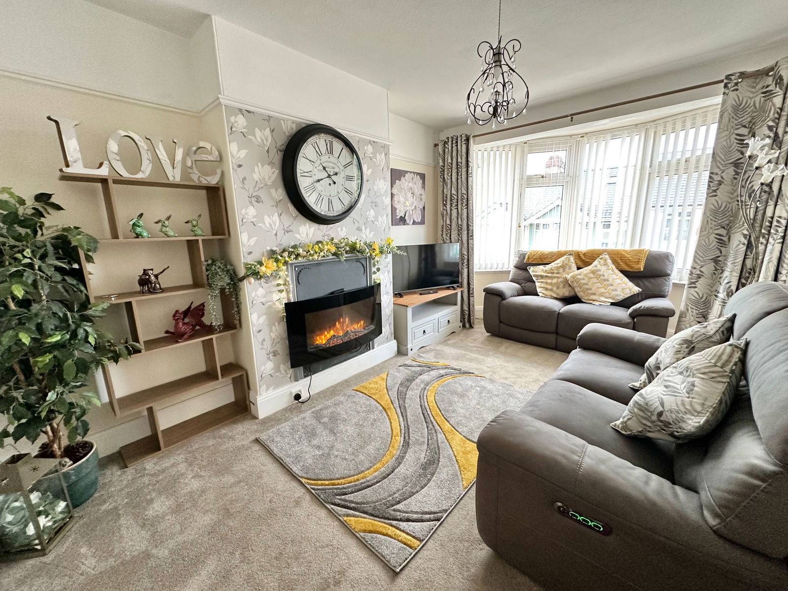 A bright and homely lounge with a double glazed bay window to the front aspect. Characterful tiled fireplace with a matching tiled hearth. Picture rails and carpeted flooring. Radiator. Two wall light points. TV point.