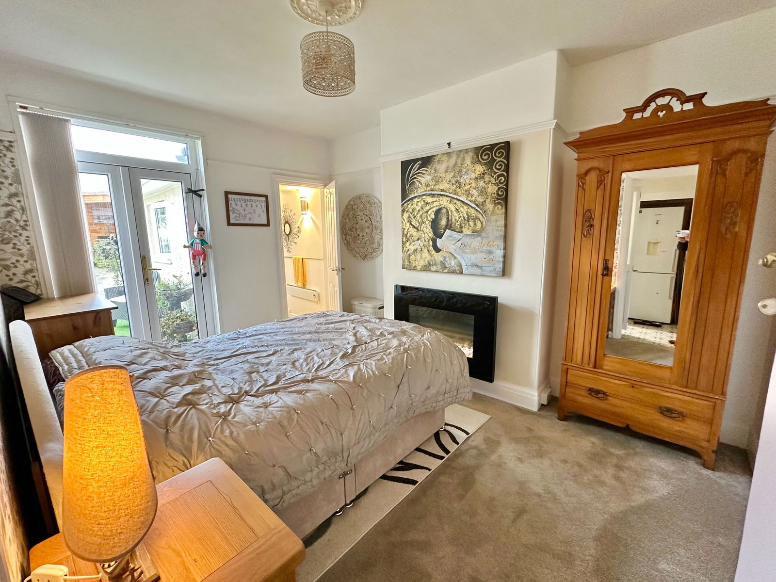 A versatile room currently arranged as a bedroom but has previously been used as a dining room. Ample space for a good size family dining table. Picture rails, ceiling rose and carpeted flooring. Double glazed French doors leading out into the rear garden. Door to:-