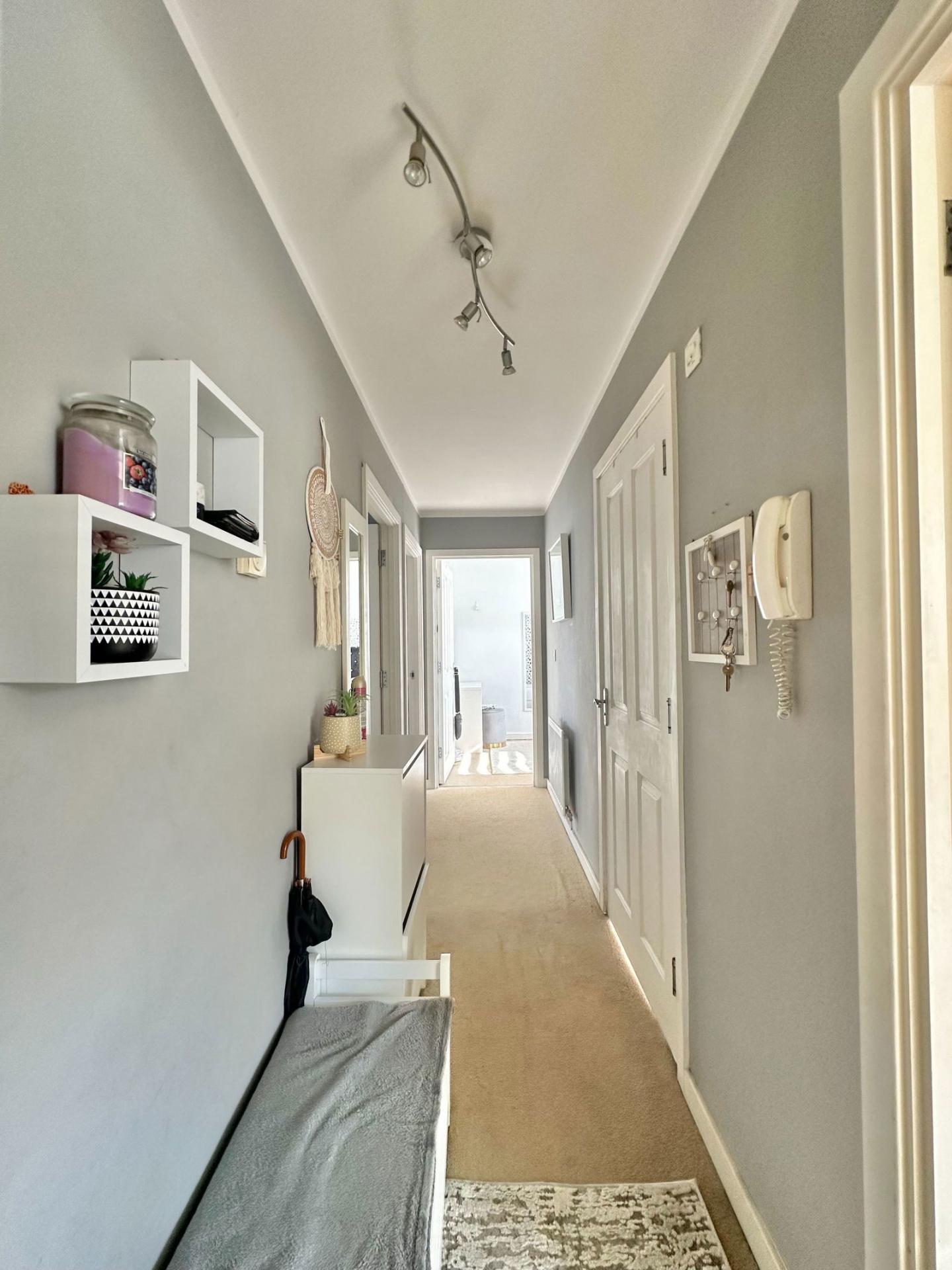 Double glazed door to the front with a secure telephone entry system, stairs leading to the apartment front door.