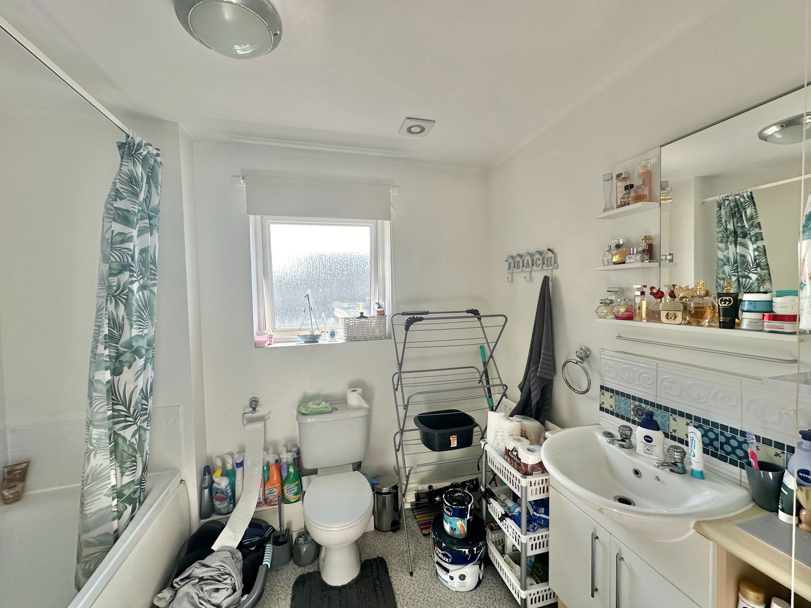 Double glazed obscured window to the rear with bath with over shower, wash basin and WC.