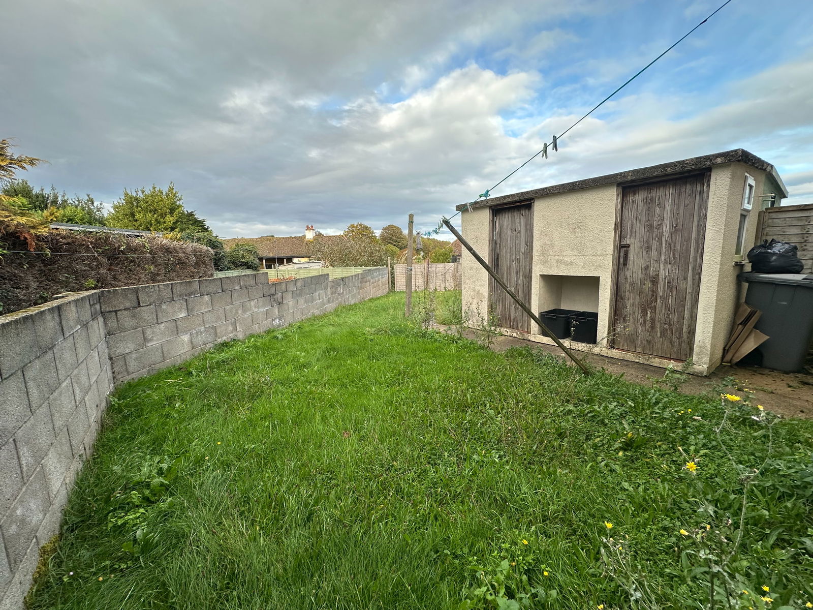 Large lawned back garden with a concrete storage shed. There is also an outside WC next to the shed.