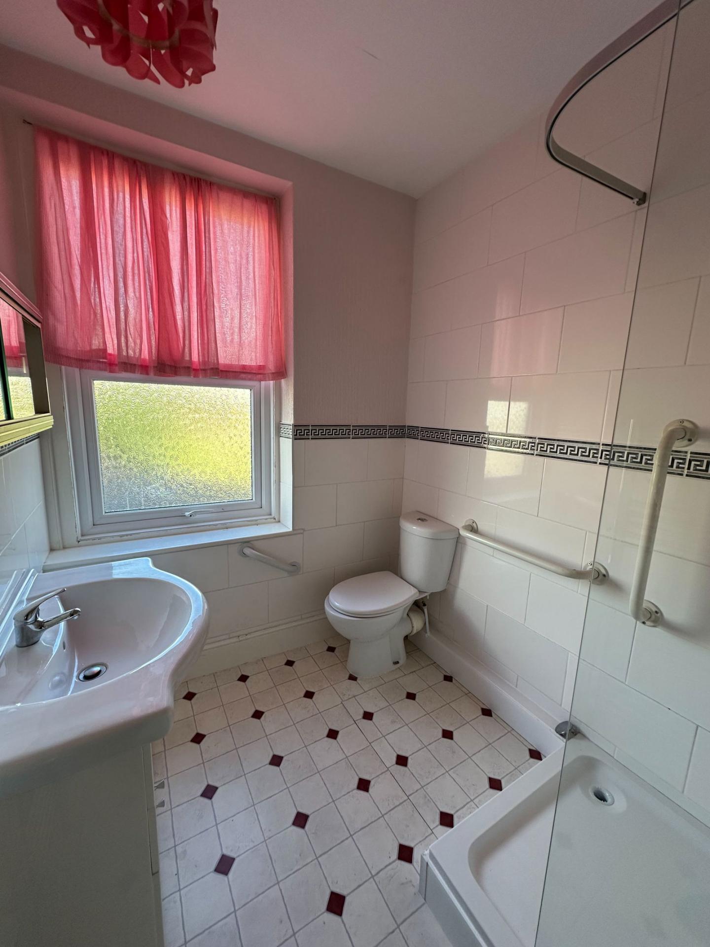 Fitted with a white suite comprising a shower shower area with Mira mains shower. Vanity unit with inset wash and basin and close couple WC with dual flush. Double glazed window. Ladder style radiator.