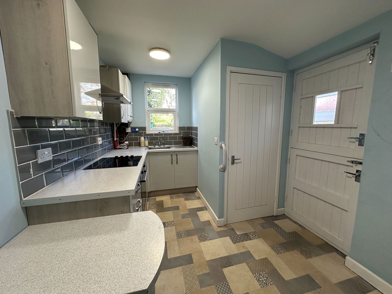 The kitchen is fitted with a range of modern grey gloss wall and base units with worksurface over. Inset glass electric hob with matching oven/grill below and stainless steel cooker hood above. BAXI gas boiler. Double glazed window to the rear. Small breakfast bar. Plumbing for washing machine. Radiator. Second double glazed window. Stable style door leading to the lean to conservatory room. Door to;