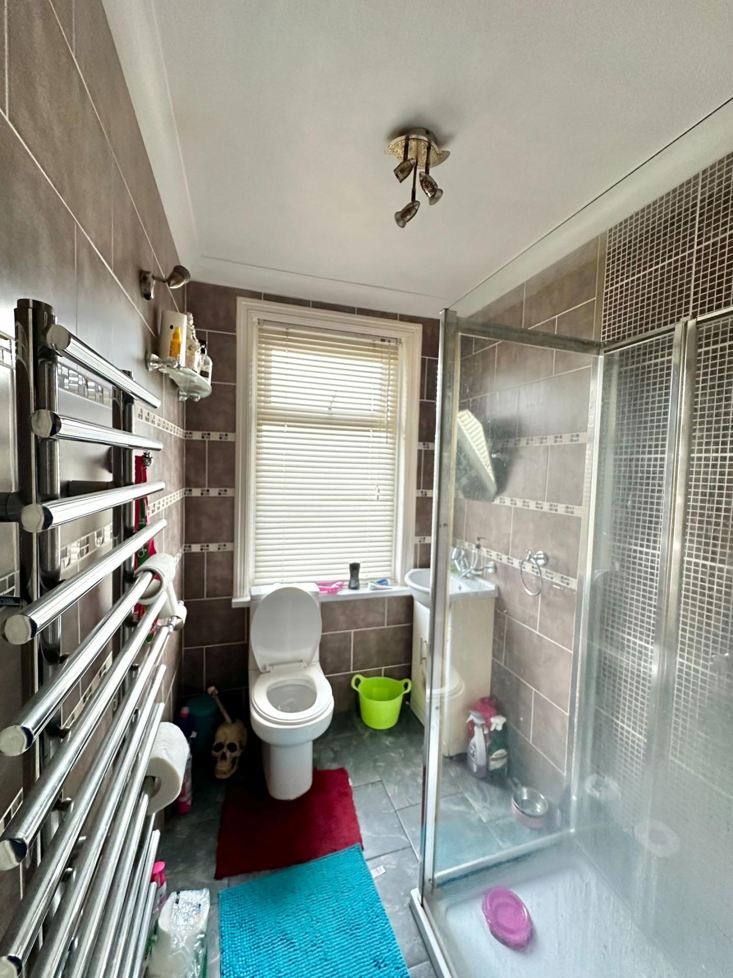 SHOWER ROOM Fitted with a three piece white suite comprising a vanity unit, push button WC and a shower unit with shower above. Chrome heated towel radiator. Stylish fully tiled walls and a tiled flooring. Double glazed frosted window to the front aspect.