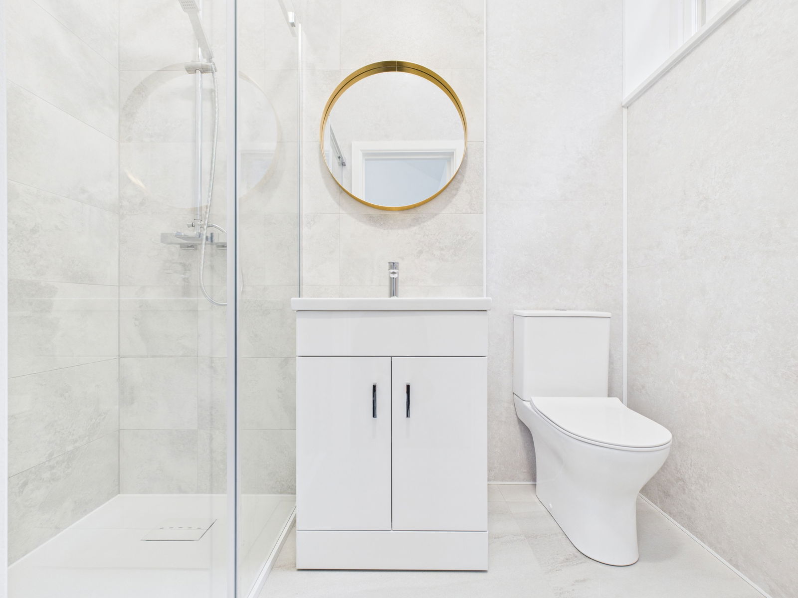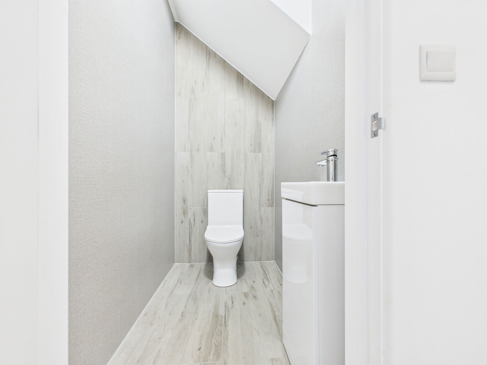 DOWNSTAIRS WC A contemporary white suite with close couple W/C, with dual flush and vanity unit with inset wash hand basin. Wood effect to floor and walls along with contrasting acrylic panelling.
