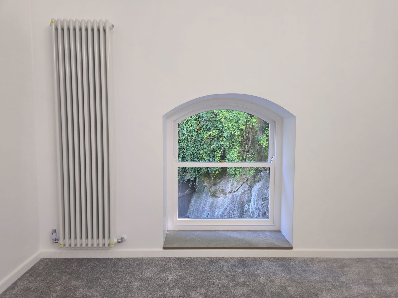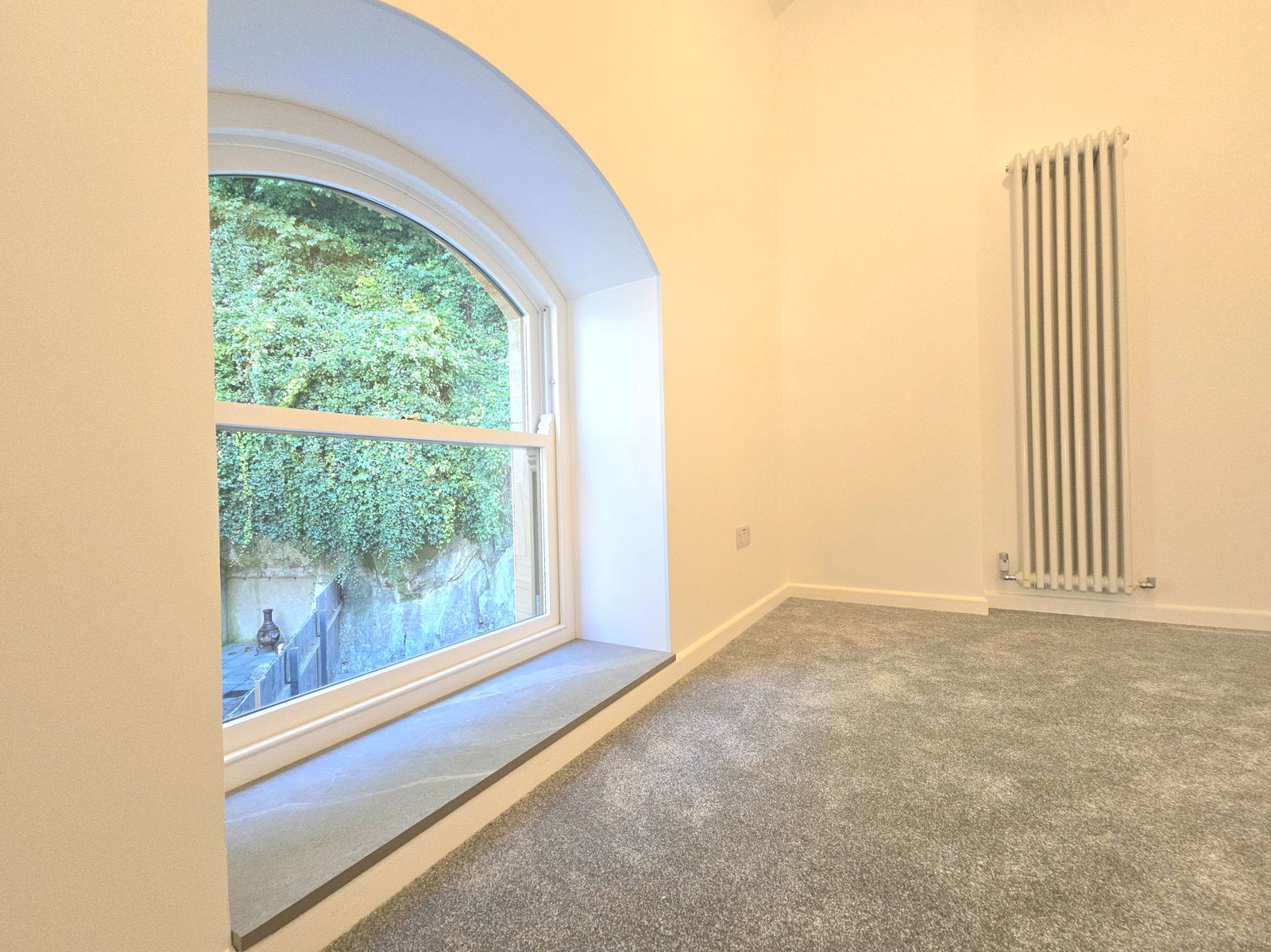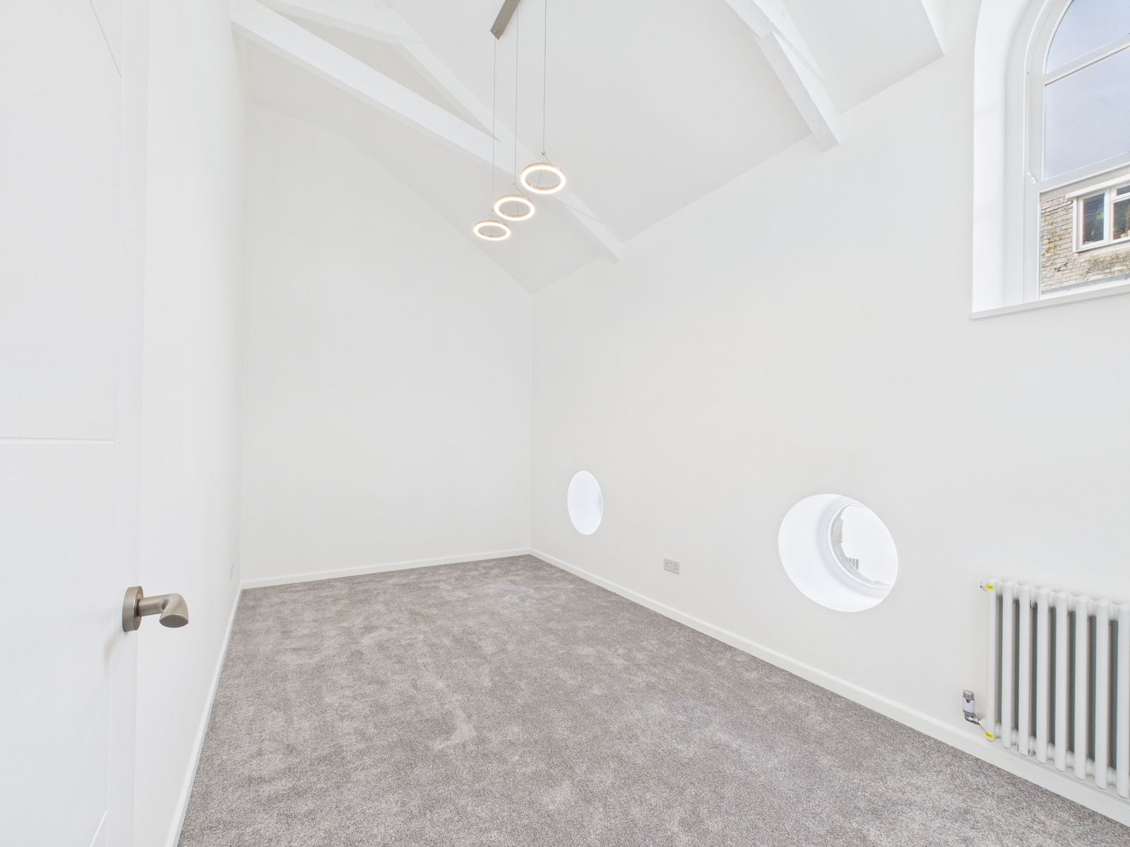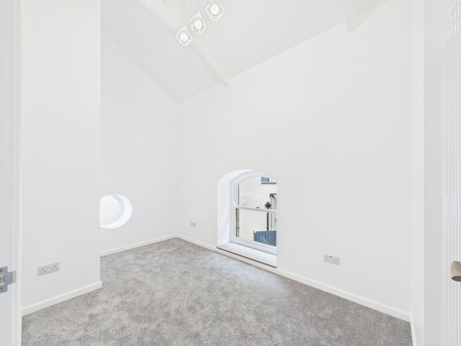 BEDROOM THREE - 3.7m x 2.2m (12'1" x 7'2") A further double room with low level double glazed porthole window and arched sash window with dressed stone cill. The ceiling is also vaulted with the original brace beam work. Modern radiator. Power points one with USB charging points.
