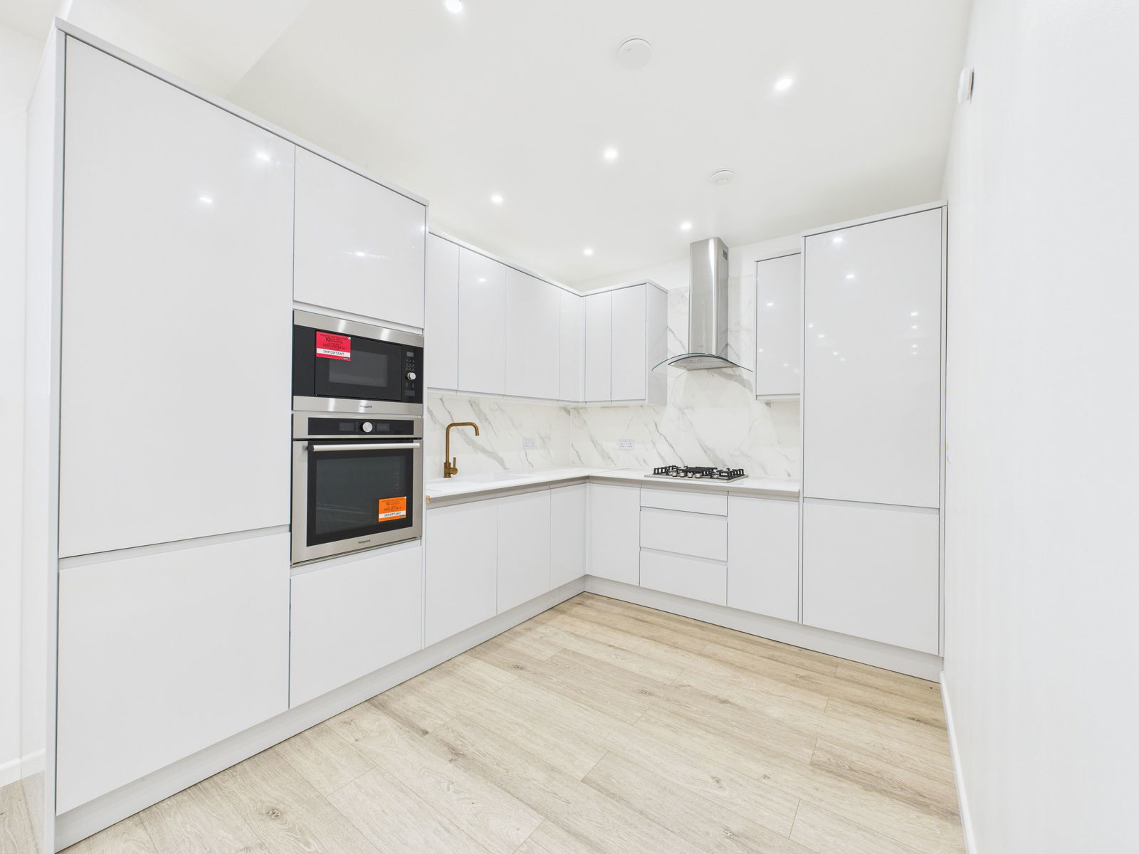 KITCHEN - 3.2m x 2.6m (10'5" x 8'6") A stylish range of modern light grey high gloss units with soft close doors and white marble effect counter tops. There is a range of built in Hotpoint appliances including stainless steel gas hob with Cooke and Lewis stainless steel cooker head over, oven and microwave. Integrated white composite sink with black mixer tap over. Cupboard to accommodate a fridge freezer. Cupboard housing Viessmann gas boiler with digital controller and app operation facility. There is room in the kitchen for additional worktops or breakfast table and chairs. Wood effect flooring. Spot lights to ceiling. Stairs with sensor LED tread lights leading to the first floor landing. Within the impressive stairwell are two original double glazed porthole windows with inset mini spotlights creating a comforting glow in the darker winter nights. This is complimented by a modern remote controlled statement light fixture over the stairs with graduating light intensity and colour changing LEDS.