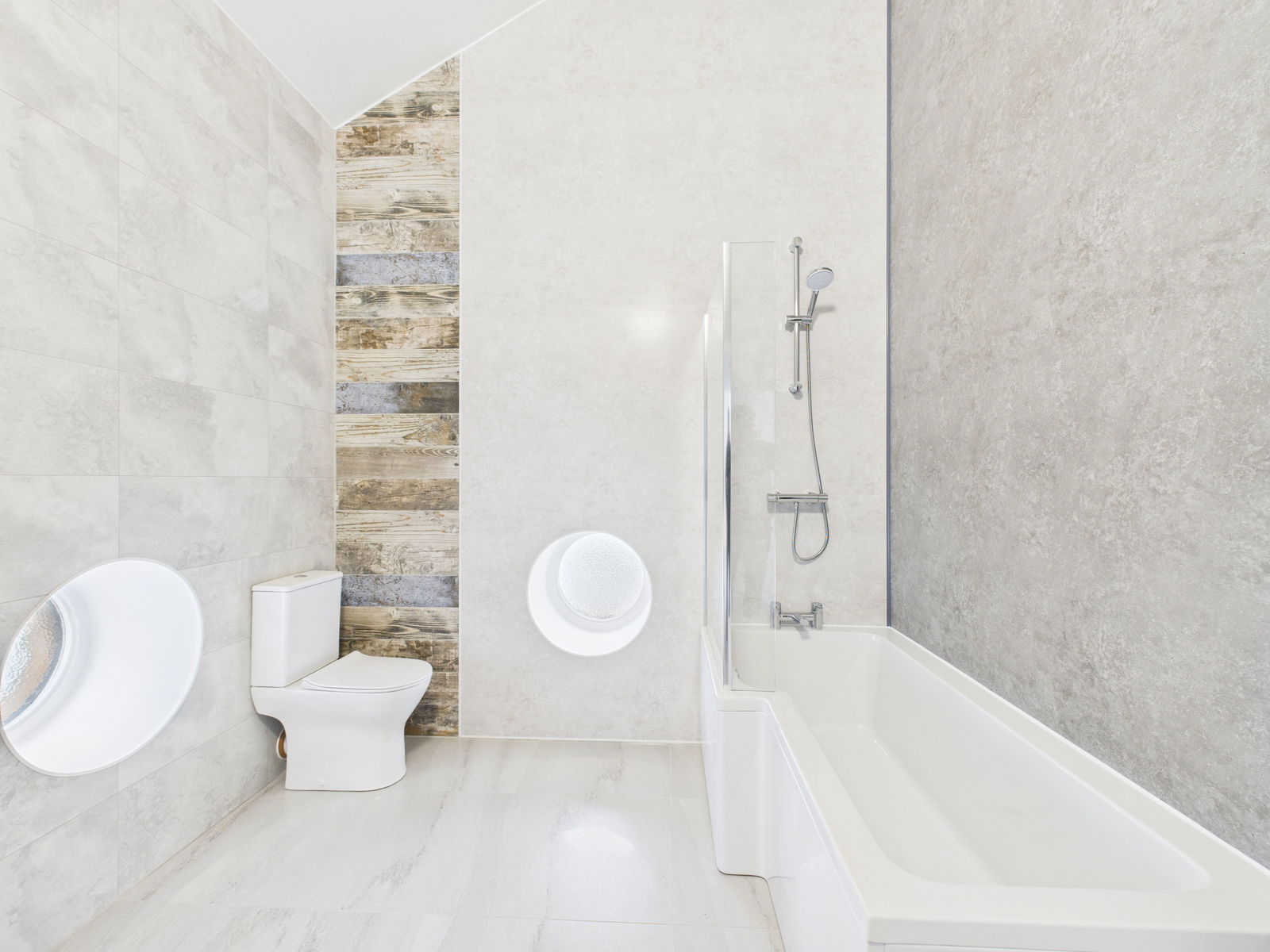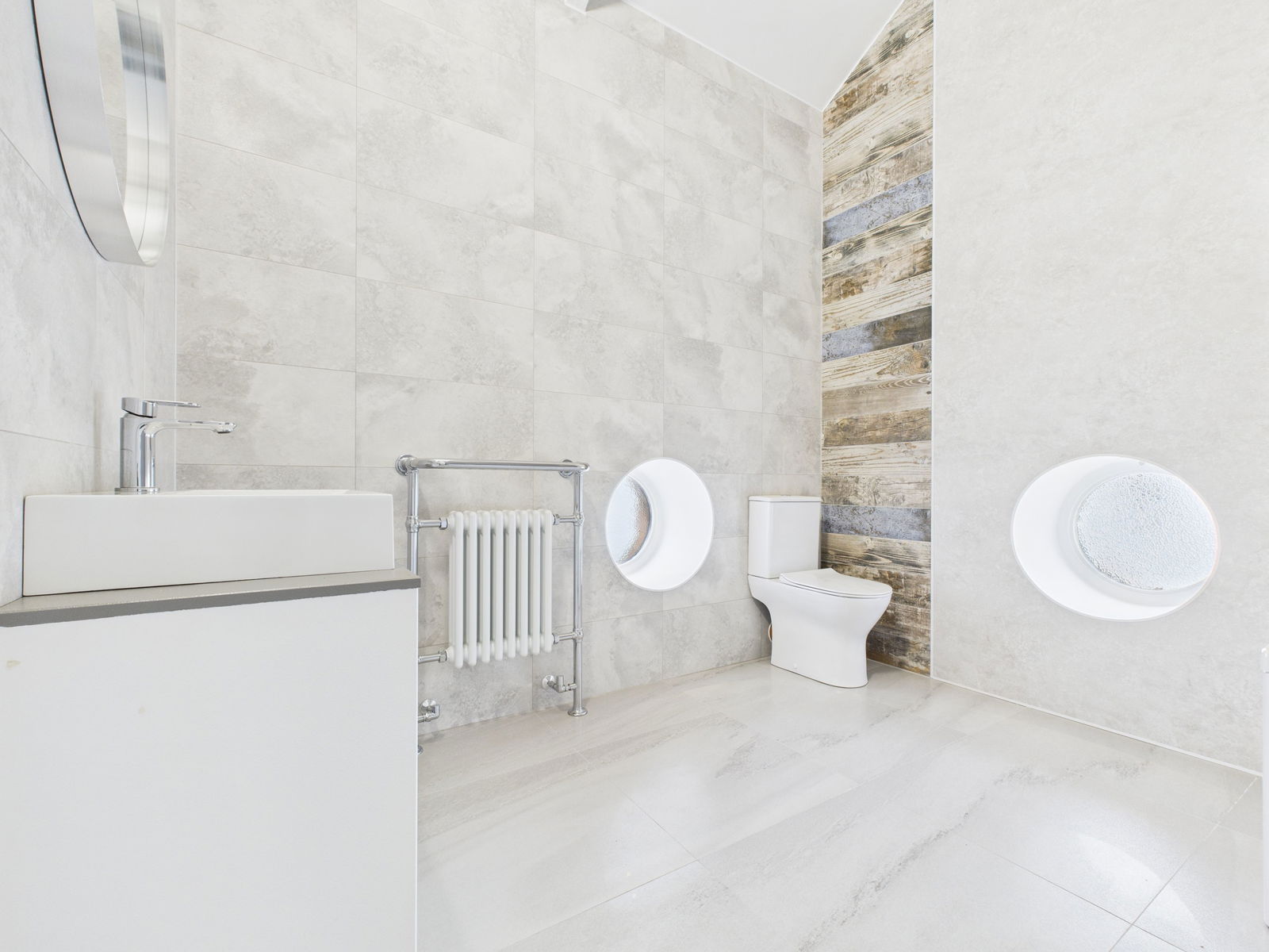 MAIN BATHROOM This modern contemporary bathroom is large. It measured 2.7m x 2.5m (max) and has a high beamed vaulted ceiling. There is a luxury white suite offering a shower bath with mixer tap plus mains fed shower unit and glass screen. There is also a wide vanity unit with full width surface mounted wash basin and mixer tap. Victorian style period radiator with towel rail. Again stylishly furnished with complimentary stone effect tiling and wall panels with feature 'driftwood' filing. Wood effect flooring. Two double glazed porthole windows with mini spot lights creating effect mood lighting.
