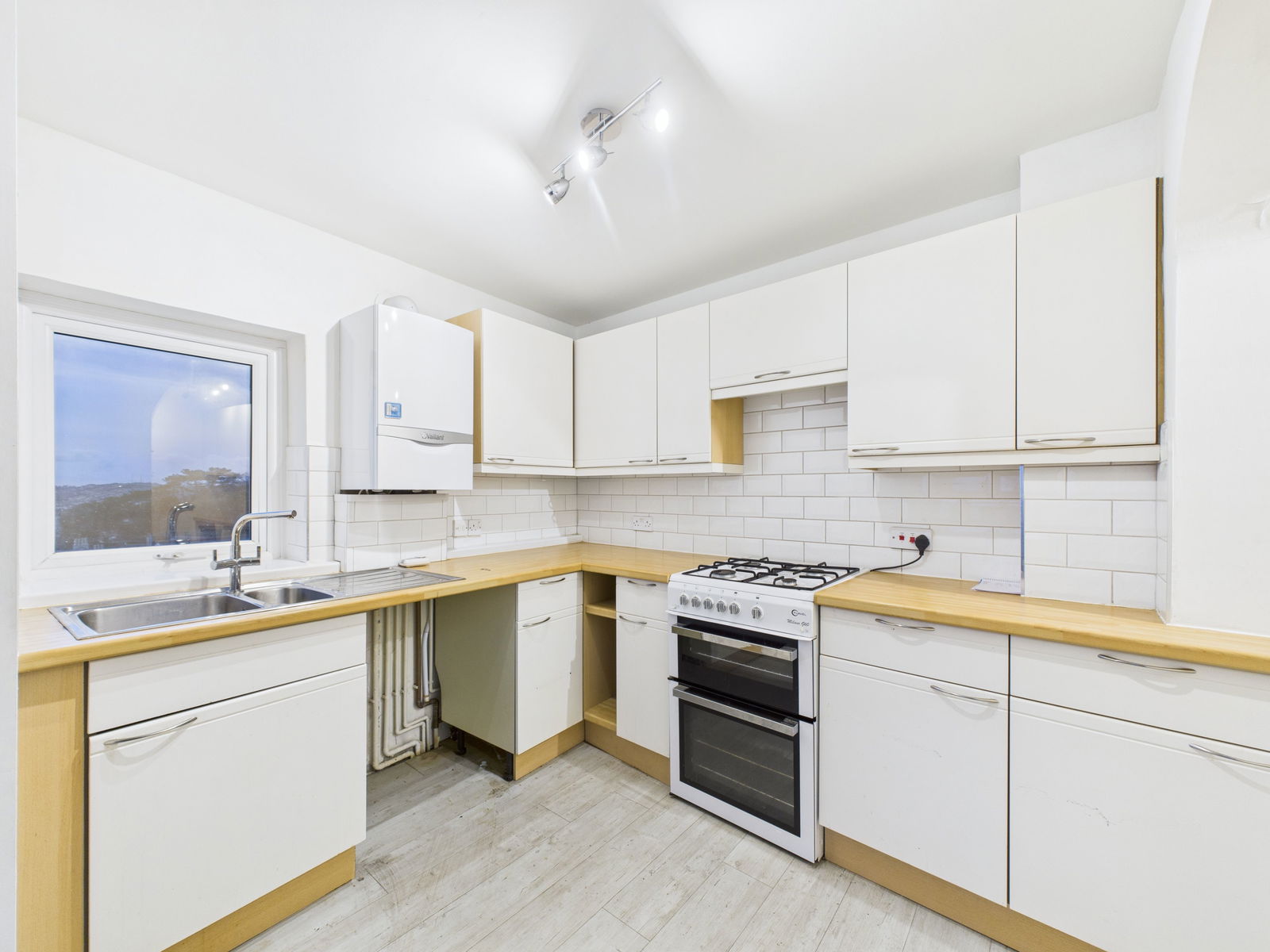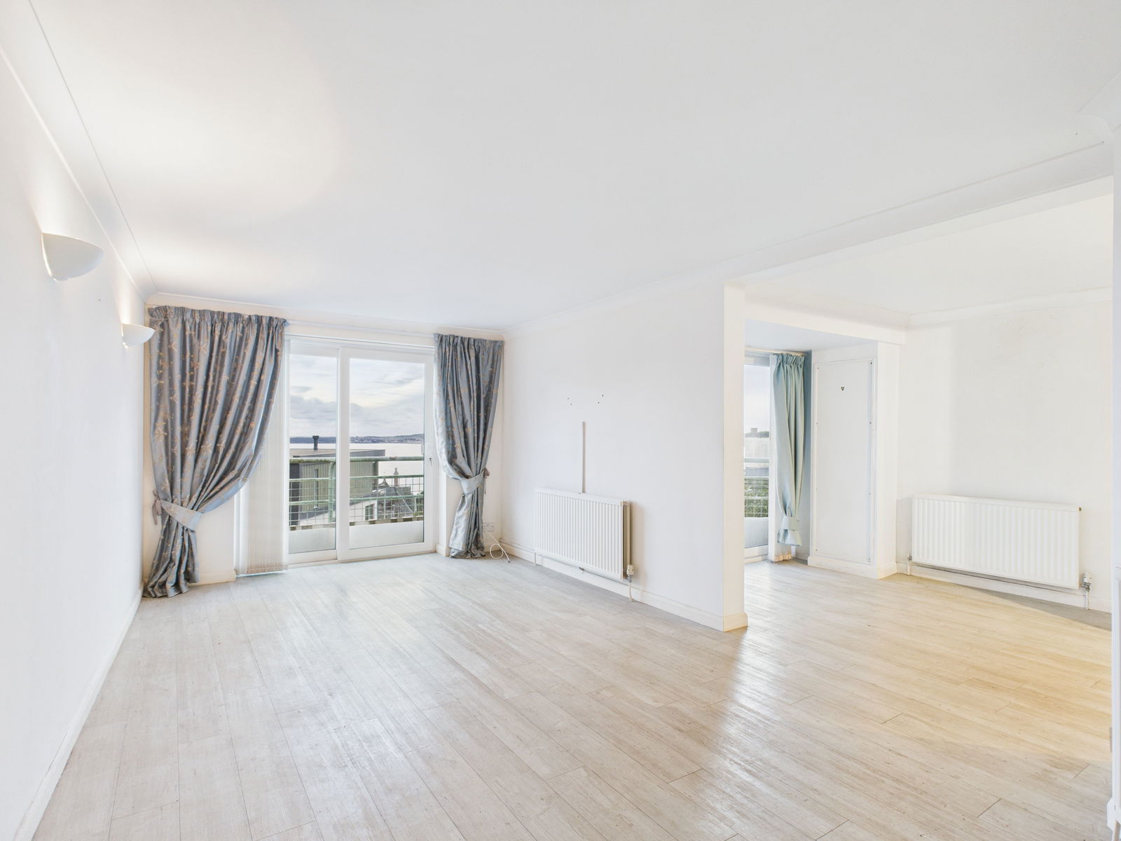 OPEN PLAN KITCHEN/DINER/LOUNGE - 5.98m x 5.3m (19'7" x 17'4") Three radiators, French doors out to Juliet balcony from the lounge and French doors to balcony from the dining room; both with spectacular sea views. Kitchen with cupboards and drawer over and under surfaces, free standing cooker, space for fridge freezer and space for a washing machine. Window out to sea views. Storage cupboard.