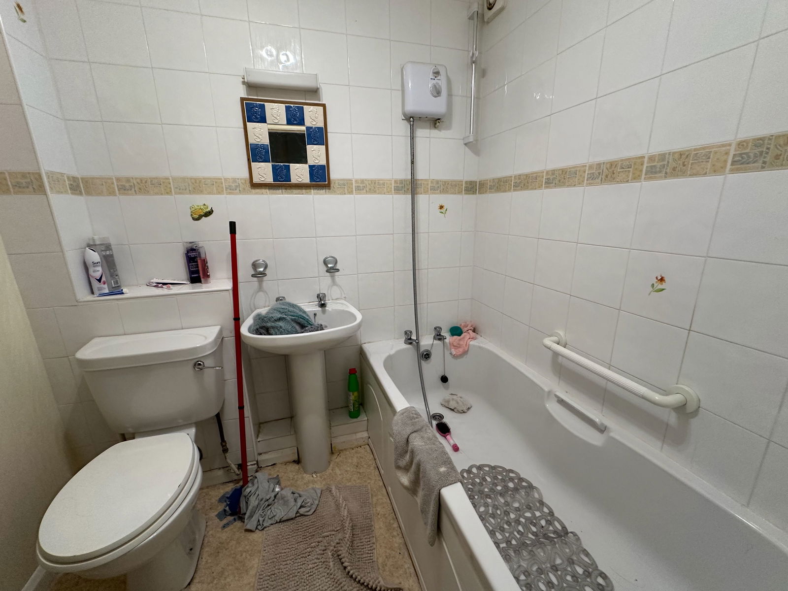 BATHROOM White bathroom suite comprising bath, overhead shower, wash basin and low level WC.