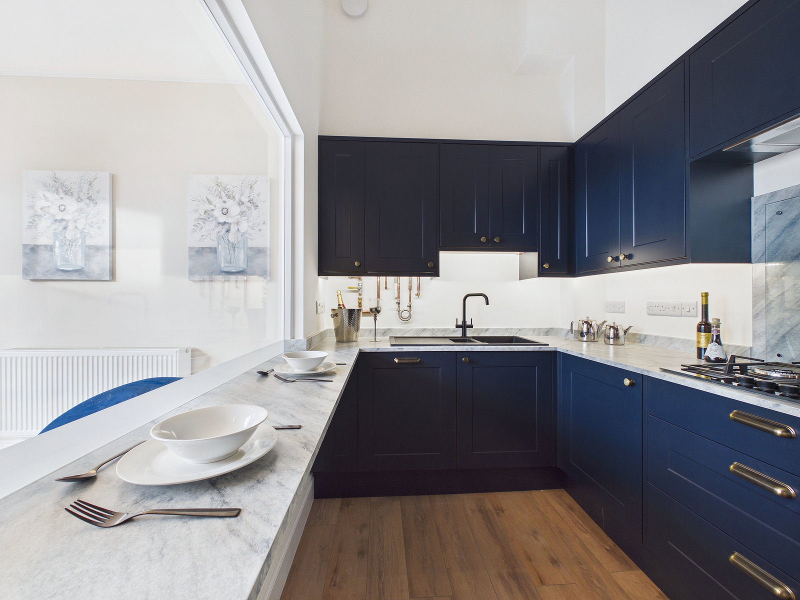 KITCHEN A beautifully appointed kitchen fitted with a range of contemporary wall and base units. There is a range of integrated appliances to include built in oven and microwave, a five burner hob with glass splashback, dishwasher and fridge/freezer and washer dryer. There is a large glass window from the kitchen into the lounge and enjoys views over private patio/lawn area.