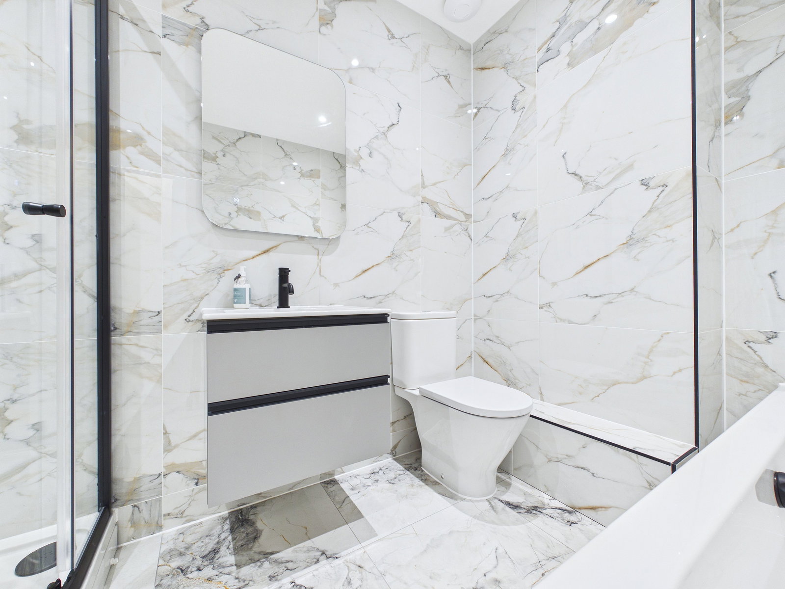 ENSUITE SHOWER ROOM Beautifully finished with matching suite having a large shower cubicle with Bifolding doors and a mains shower with oversized head, wash hand basin with vanity unit and large light up mirror, close coupled WC with dual flush and floor to ceiling tiling.