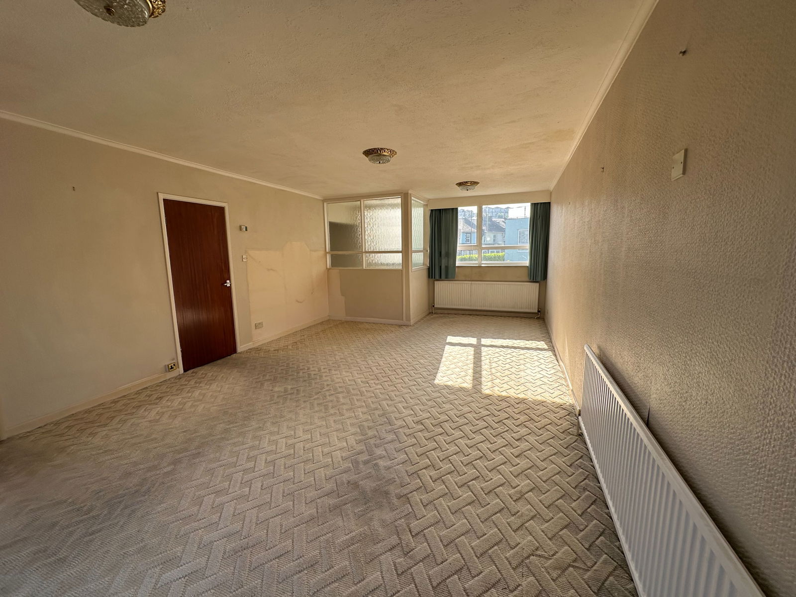 A double room with door leading out onto sun balcony , radiator.